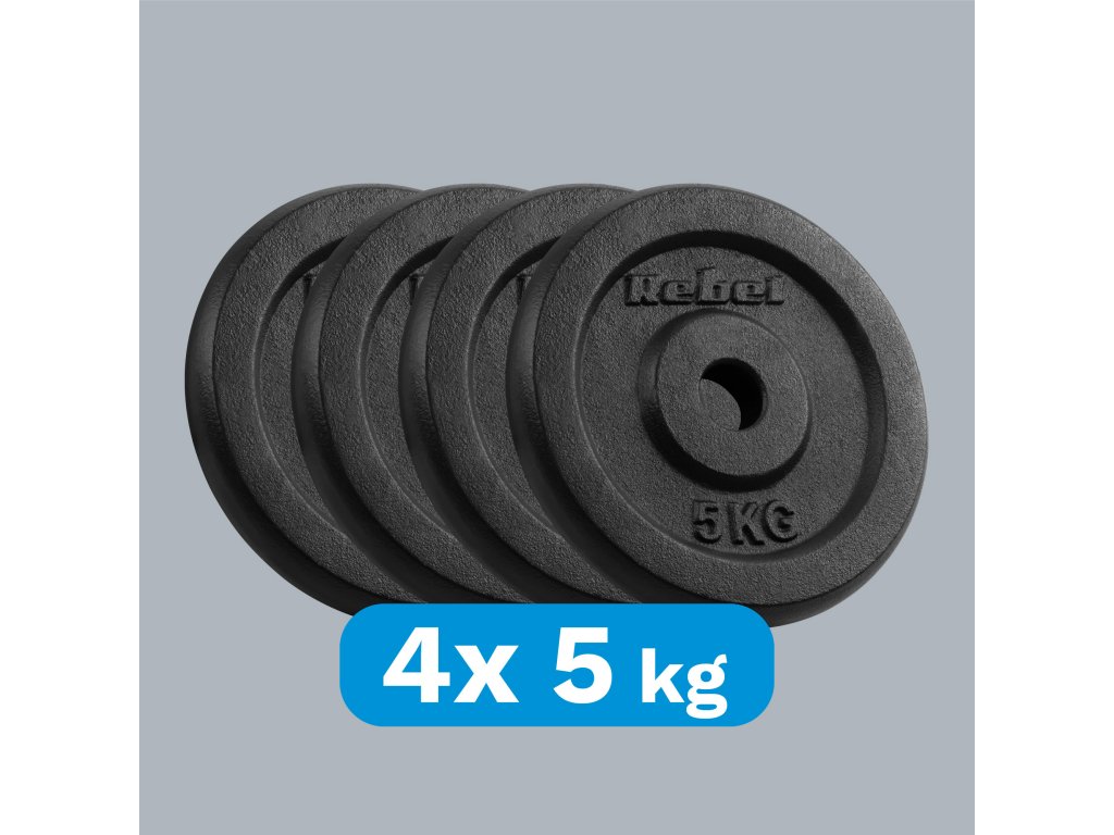 Súprava liatinových závaží Rebel Active sa skladá zo 4 platní o hmotnosti 5 kg, takže si tréning ľahko prispôsobíte vlastným schopnostiam. Ide o ideálne riešenie na posilňovanie svalov alebo intervalový tréning pre začiatočníkov aj pokročilejších.