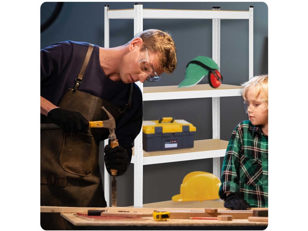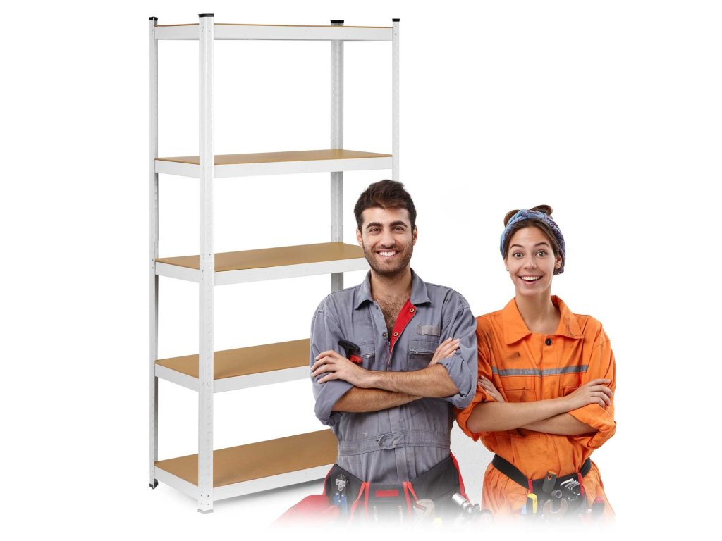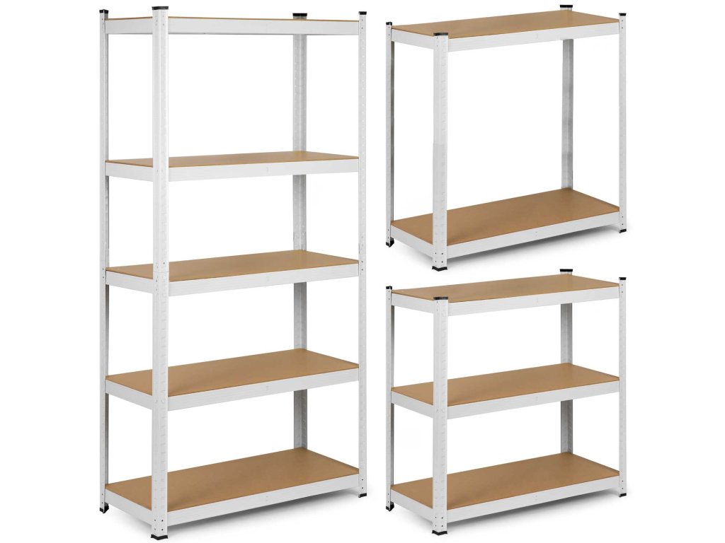 Funkčný a stabilný úložný regál v bielej farbe, ktorý je ideálny pre: