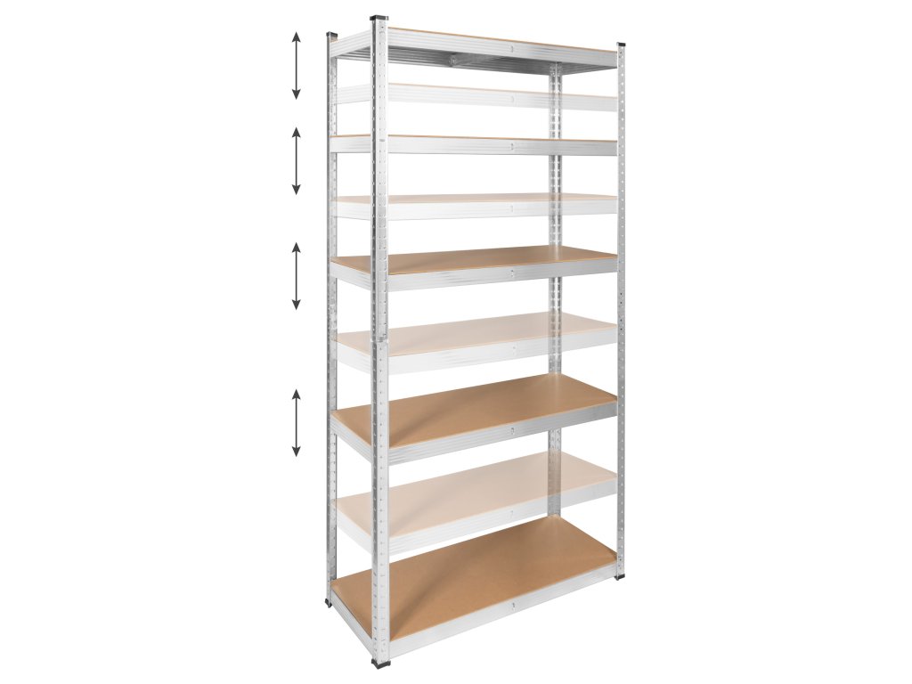 Regál je vybavený 5 nastaviteľnými policami, čo vám umožňuje ľubovoľne konfigurovať priestor vo vašej dielni alebo sklade podľa vašich potrieb. Môžete tiež nastaviť vzdialenosť medzi policami tak, aby vyhovovali rôznym veľkostiam položiek.
