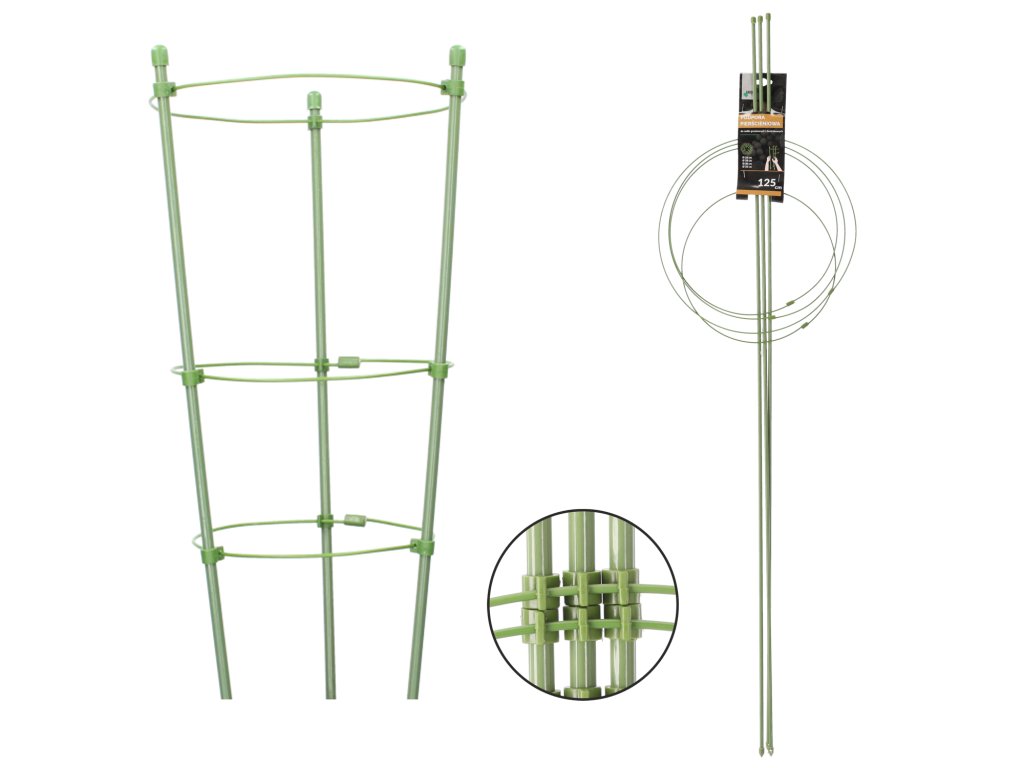 Podpora kruhová so stĺpikmi je skvelou voľbou pre rastliny v kvetináčoch a na záhony. Vďaka pevnému prevedeniu z kovu a poťahu z plastu je veľmi odolná voči poškodeniam a nepriaznivým poveternostným podmienkam, a vďaka zelenej farbe sa stáva takmer neviditeľnou na pozadí rastliny. Užitočná napr. pri pestovaní: čučoriedky, hortenzie. Zabráňuje "položeniu" rastliny a umožňuje jej harmonický rast. Podpora kruhová môže byť zaujímavou alternatívou k rôznym typom jednotlivých tyčiek. Zelená farba produktu sa ideálne kombinuje s rastlinami, taktiež ako dekorácia záhrad. Podperu je potrebné umiestniť do zeme vedľa rastliny a pripevniť k nej stonku, takto zabezpečíme dokonalú stabilizáciu a ochranu pred zlomením aj počas veterného počasia.
