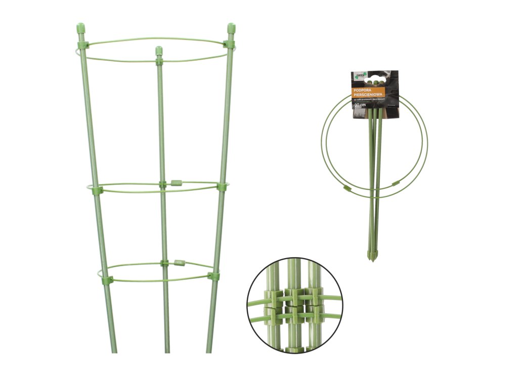 Krúžková podpora so stĺpikmi je skvelá pre izbové rastliny a záhradné záhony. Vďaka pevnému kovovému prevedeniu a plastovému krytu je veľmi odolná voči poškodeniam a nepriaznivým poveternostným podmienkam. Zelená farba spôsobuje, že podpora sa stáva takmer neviditeľnou na pozadí rastliny. Je obzvlášť užitočná pri pestovaní, ako sú čučoriedky alebo hortenzie. Podpora zabraňuje "ľahnutiu" rastliny a umožňuje jej harmonický rast. Môže byť zaujímavou alternatívou k jednotlivým tyčiam. Zelená farba sa dokonale kombinuje s rastlinami a plní aj dekoratívnu úlohu v záhrade. Podporu treba umiestniť do zeme vedľa rastliny a pripevniť k nej stonku, čo poskytuje stabilizáciu a ochranu pred zlomením, aj počas veterného počasia.