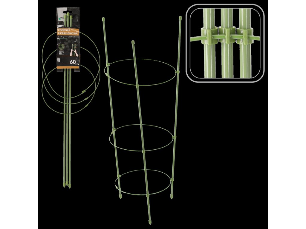 Krúžková podpora so stĺpmi je skvelou voľbou pre izbové rastliny a záhony. Vďaka pevnému prevedeniu z kovu a potiahnutiu plastom je veľmi odolná voči poškodeniu a nepriaznivým poveternostným podmienkam, a vďaka zelenej farbe sa stáva takmer neviditeľnou na pozadí rastliny. Užitočná napr. pri pestovaní: amerických čučoriedok, hortenzií. Zabráni "pokladaniu" rastlín a umožní jej harmonický rast. Krúžková podpora môže byť zaujímavou alternatívou k rôznym druhom jednotlivých tyčí. Zelená farba produktu ideálne ladí s rastlinami, rovnako ako dekorácia záhrad. Podporu je potrebné umiestniť do zeme vedľa rastliny a pripevniť k nej stonku, čím zabezpečíme vynikajúcu stabilizáciu a ochranu pred zlomením aj počas veterného počasia.