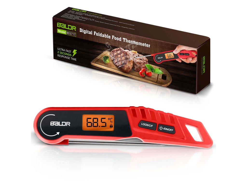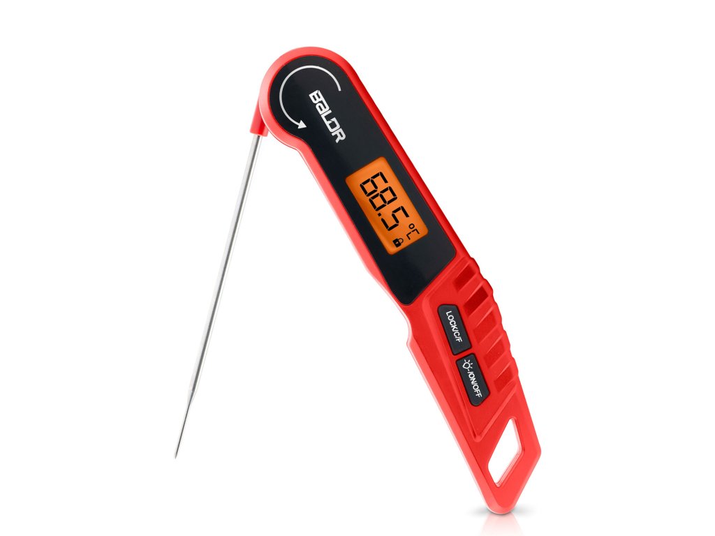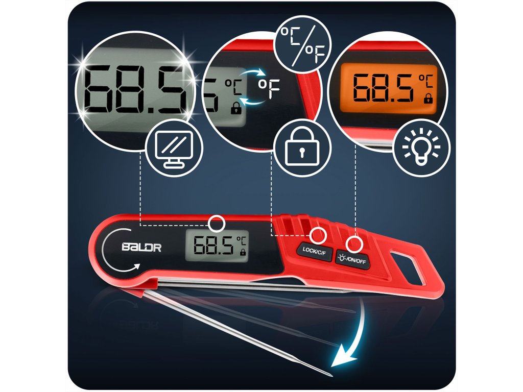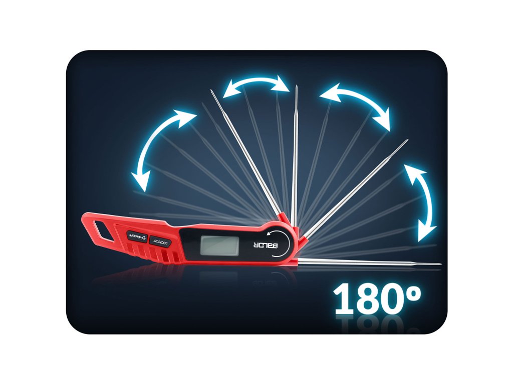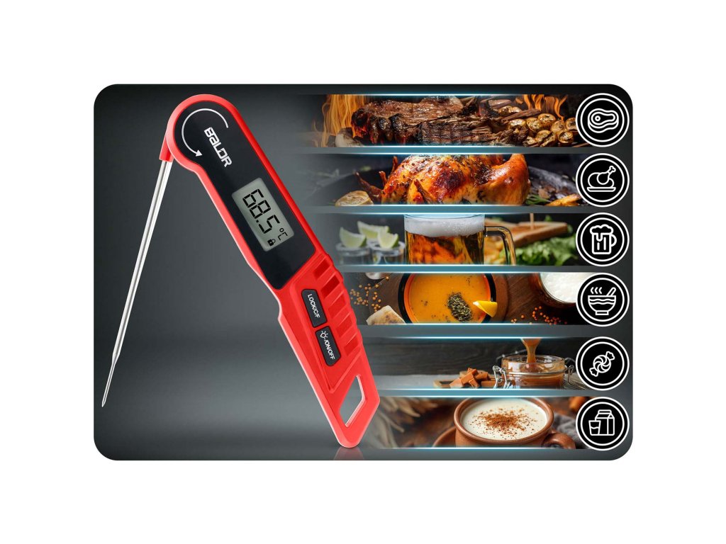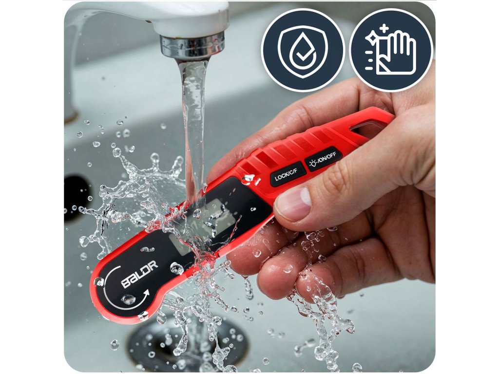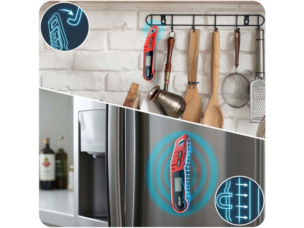 - Výnimočné pohodlie a trvanlivosť: automatická rotácia displeja, podsvietenie, funkcia blokovania merania, odolnosť voči vode IPX6 a silný magnet na pripevnenie na chladničku alebo gril — to všetko, aby vám uľahčilo prácu v kuchyni.