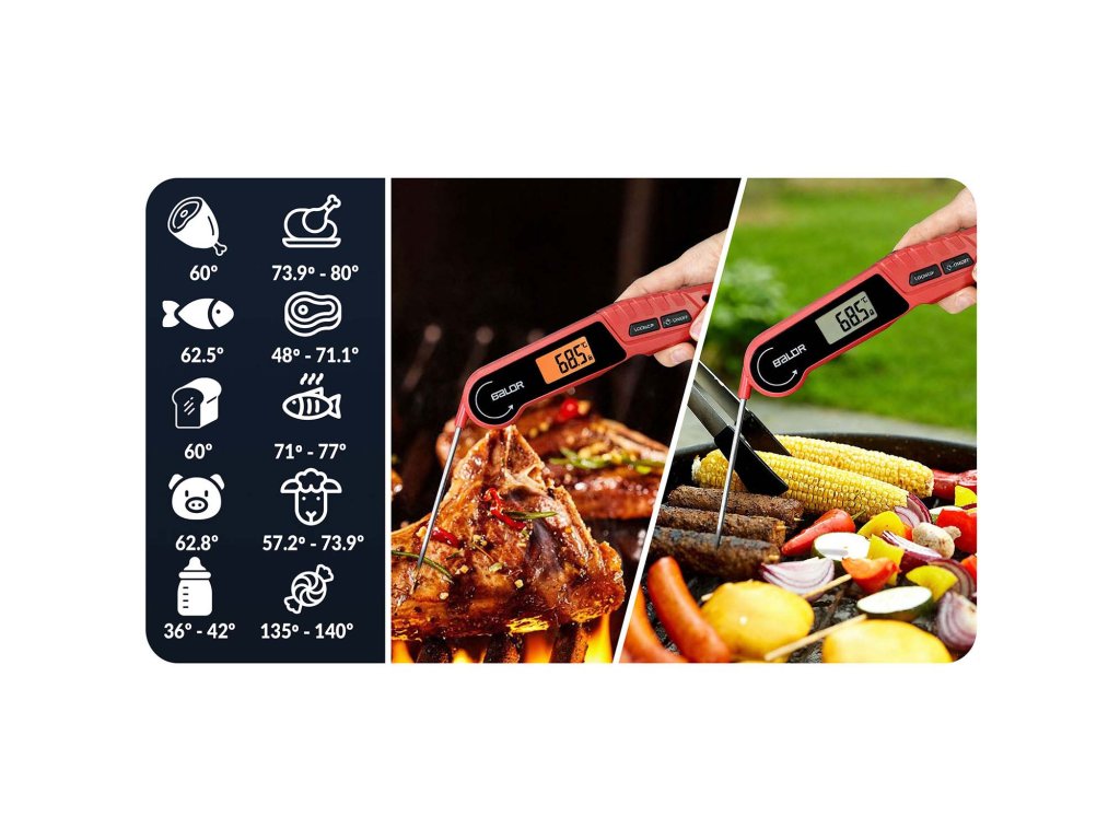 Teplomer umožňuje dosiahnuť perfektné výsledky na rôznych jedlách: od šťavnatých steakov a burgerov, cez jemné ryby a morské plody, až po chrumkavé klobásky a hydinu. Vďaka presnému odčítaniu sa vyhnete nedopečenia a vysušeniu a každý kúsok mäsa bude presne taký, ako máte radi – bez hádania a dymových prekvapení.