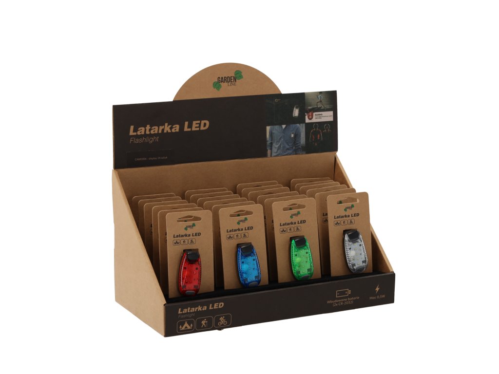 LED cyklistická lampa. K lampe sú priložené dve batérie (CR-2032) Každá lampa je pripevnená k ozdobnému kartóniku. Na jednom displeji sa nachádza 24 ks. Na výber sú dve farby:...
