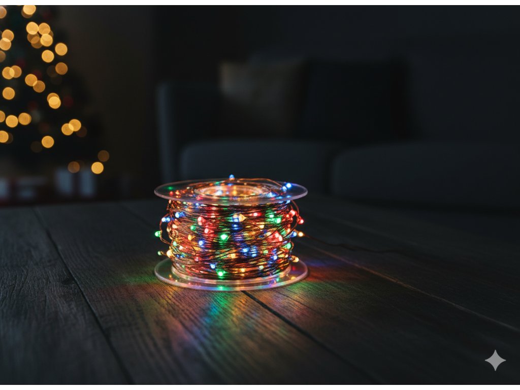 Strieborný kábel takmer mizne v pozadí, čo spôsobuje, že farebné svetelné body vyzerajú ako vznášajúce sa vo vzduchu ?? Cievka zaručuje pohodlné skladovanie aprogramátor s pamäťou a časovačom poskytuje plnú kontrolu nad svetelnými efektmi.