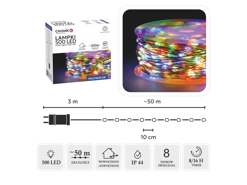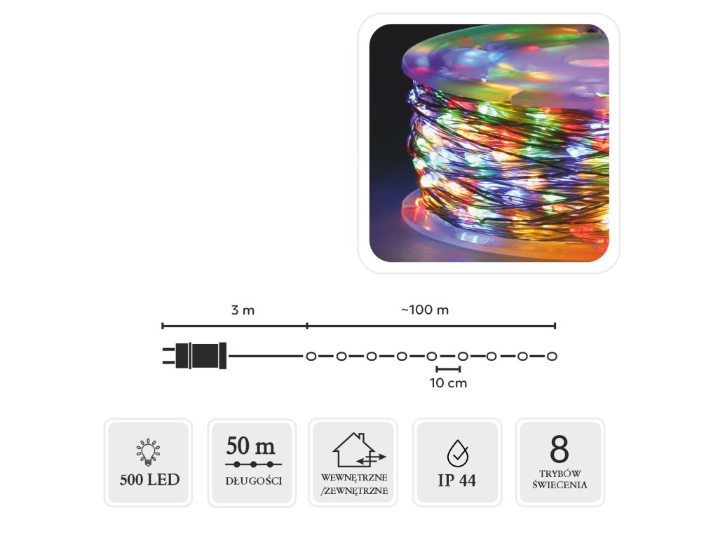 500 žiarovkami multikolor rozžiaria tvoj dom, balkón alebo záhradu rozprávkovou žiarou. Vďaka dĺžke 50 metrov môžeš vytvoriť naozaj veľkolepú dekoráciu!