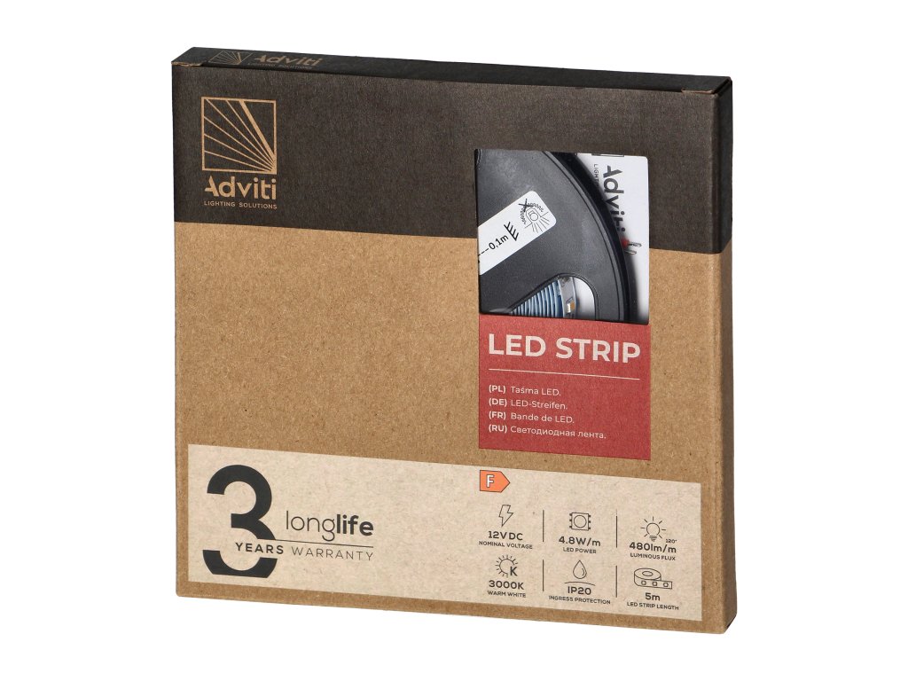 - Aplikácie: LED pásik 5m, 3000K, 500lm, IP20, 12V je skvelým doplnkom na zlepšenie interiérového dizajnu, môže byť použitý v obývačkách, kuchyniach, kúpeľniach, ale aj v komerčných priestoroch, ako sú kaviarne, butiky, alebo showroome.