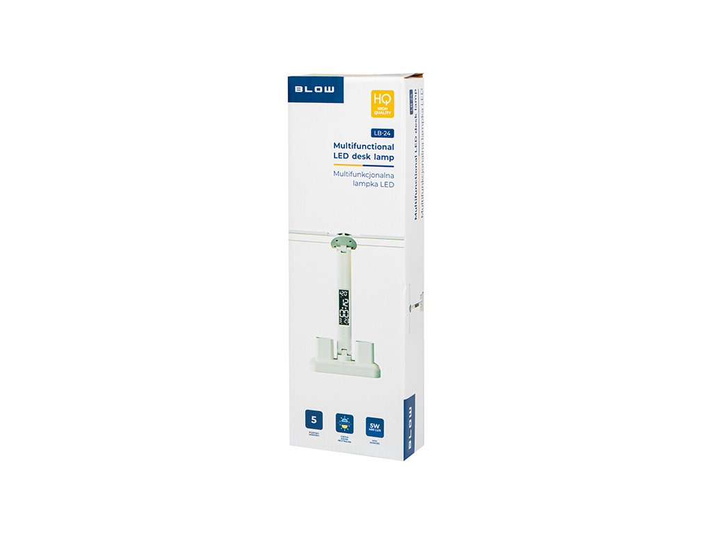 Na prednej strane lampičky sa nachádza prehľadný LCD displej, ktorý zobrazuje aktuálny čas, teplotu a deň v týždni – všetko, čo potrebujete poruke. To spôsobuje, že lampka BLOW LB-24 spája užitočné funkcie s estetikou. Biela, minimalistická skrinka v kombinácii s digitálnym displejom jej dodáva moderný charakter, ktorý sa hodí do každého interiéru – od kancelárie po študentovu izbu.
