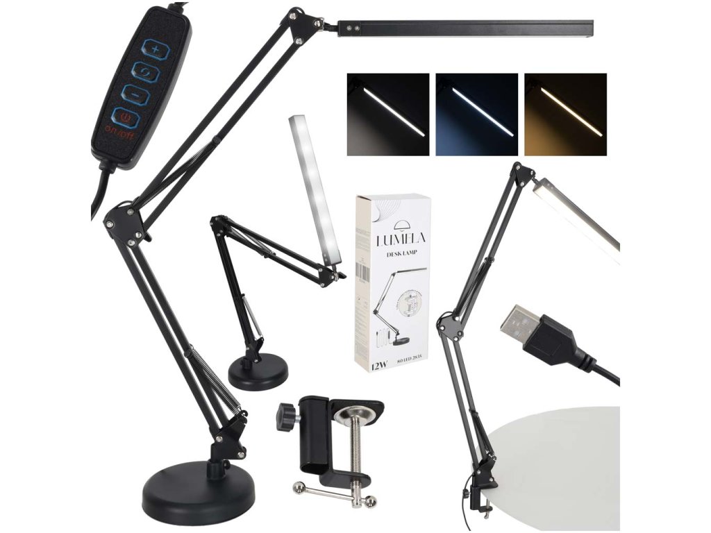 LED stolová lampa USB otočné rameno 2 spôsoby upevnenia