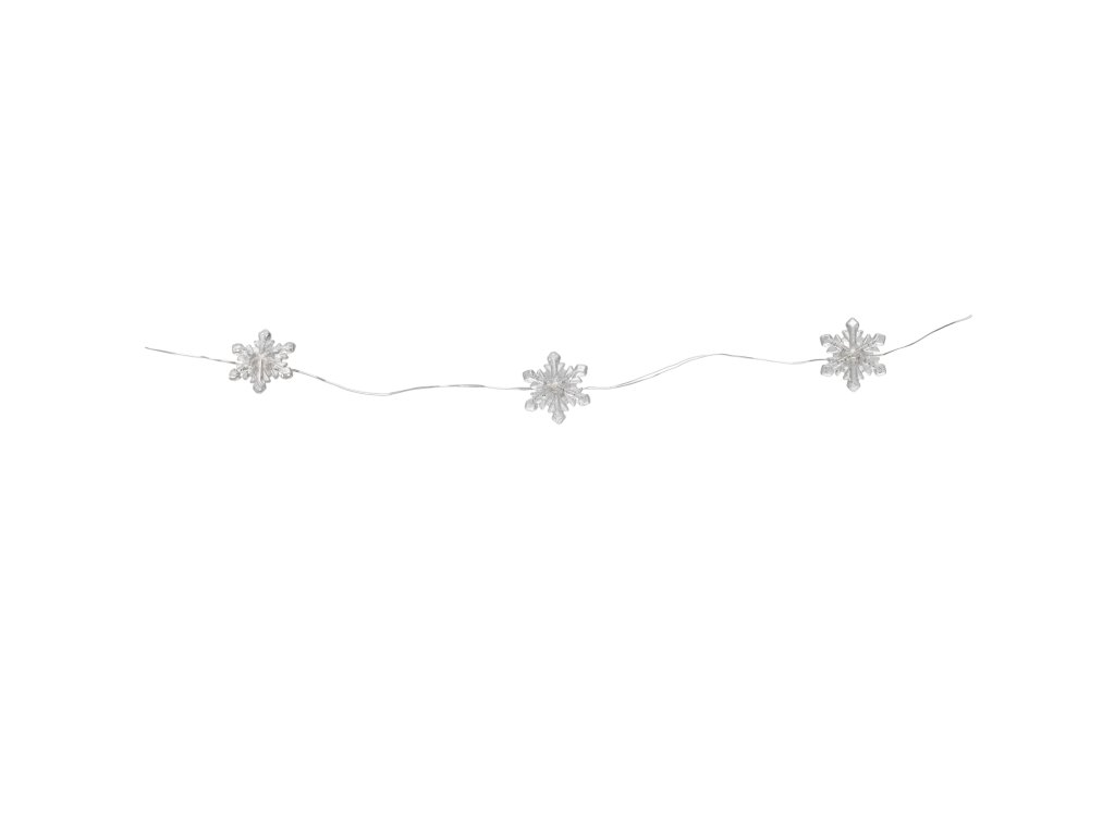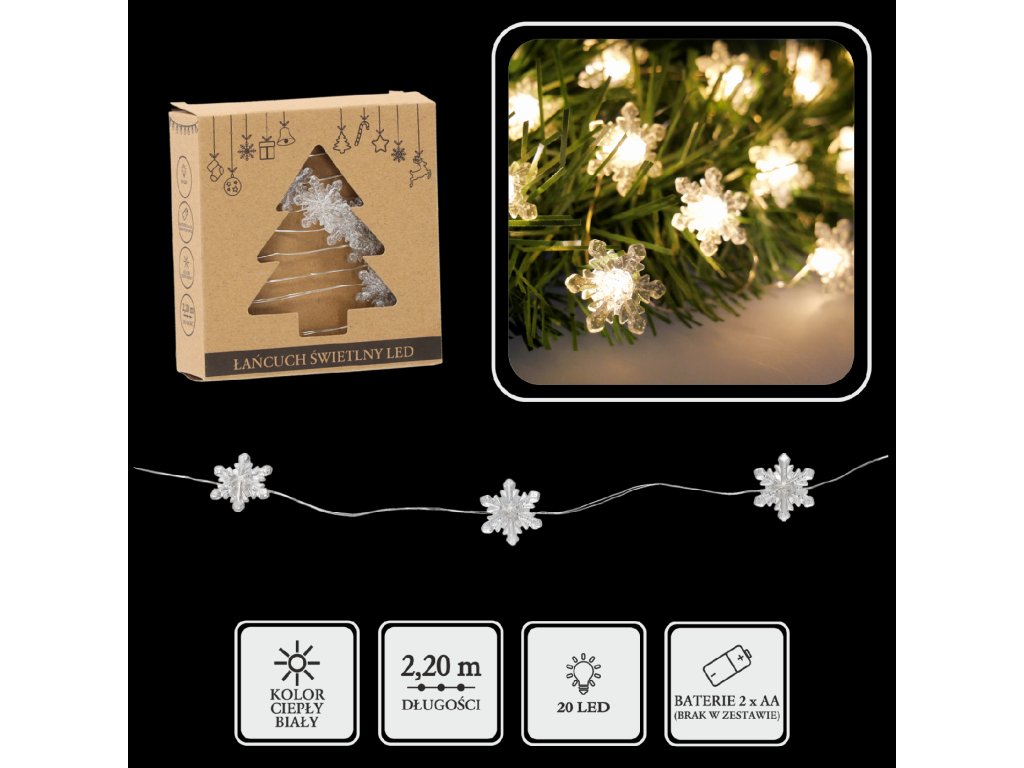 Pôvabná LED svetelná reťaz s motívom vločiek, vybavená 20 diódami vyžarujúcimi teplé biele svetlo. Ideálna na zimné sviatočné dekorácie – na stromček, do aranžmánov, na poličky alebo do okien. Napájanie na batérie (2 x AA) poskytuje slobodu pri aranžovaní a možnosť umiestniť lampičky kamkoľvek bez potreby pripojenia do elektrického prúdu.