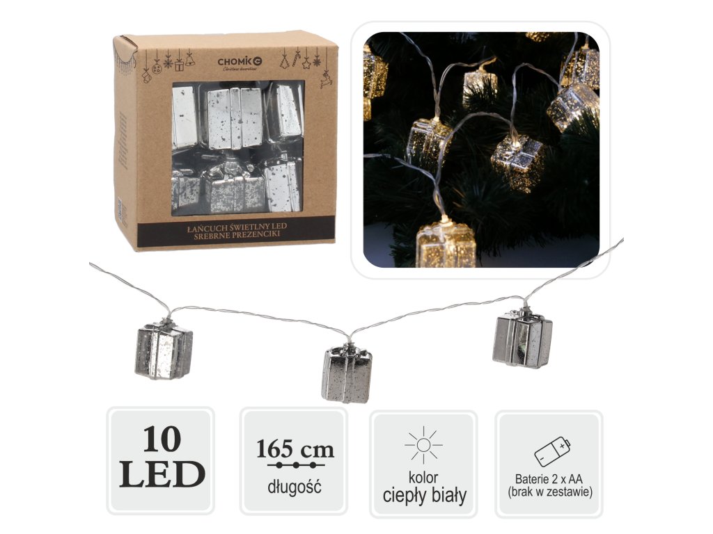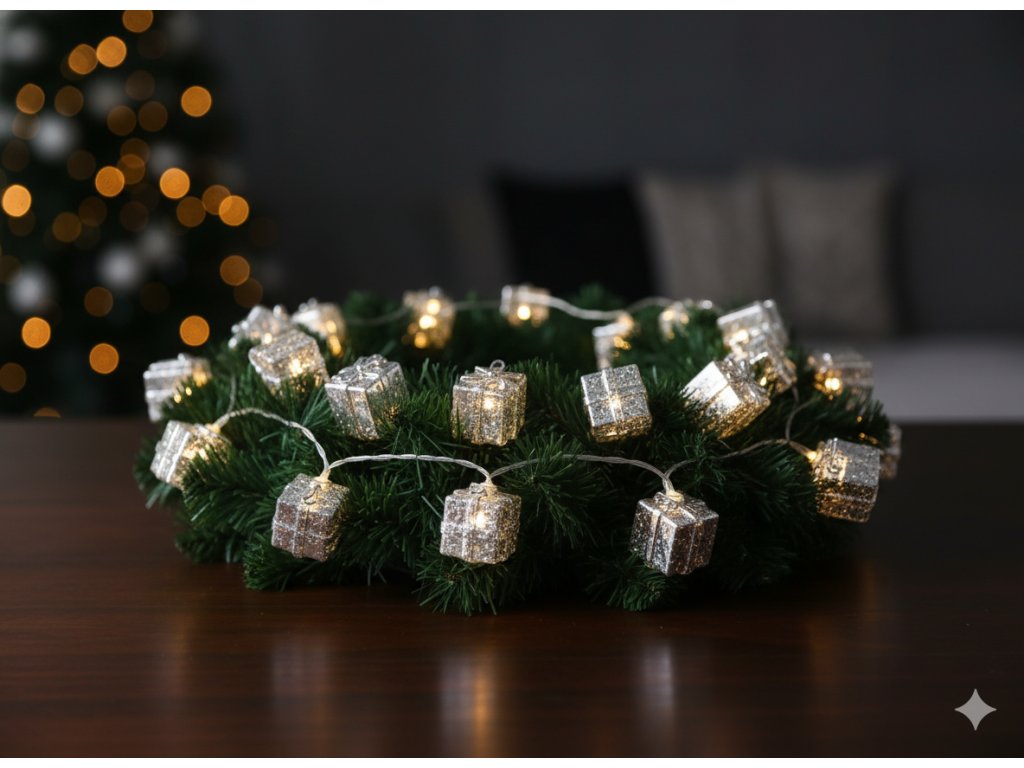 LED SVETELNÁ REŤAZ STRIEBORNÉ DARČEKY 10 L TEPLÁ BIELA *0962