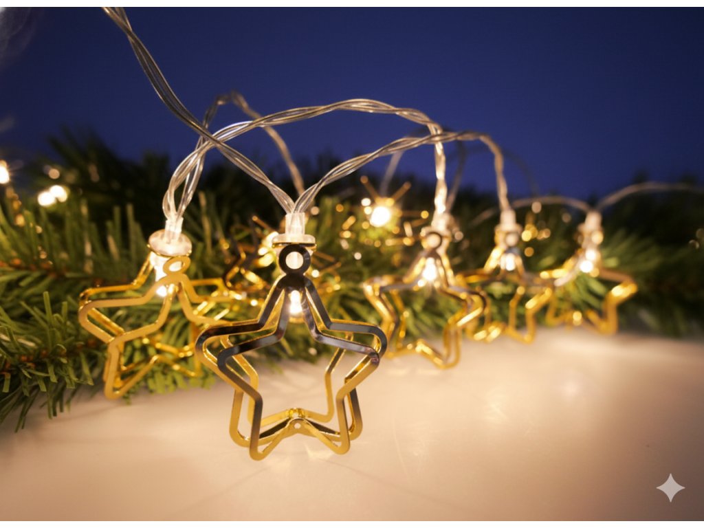 LED SVETELNÁ REŤAZ ZLATÁ KOVOVÁ - 3D HVIEZDIČKA 10L NA BATÉRIE *4109