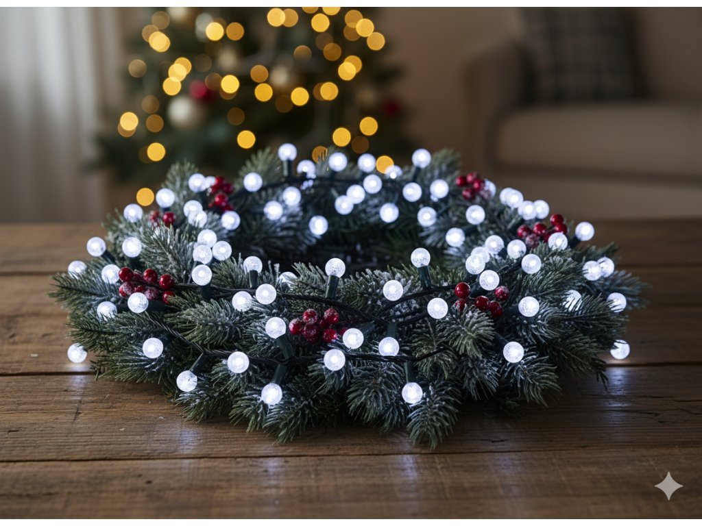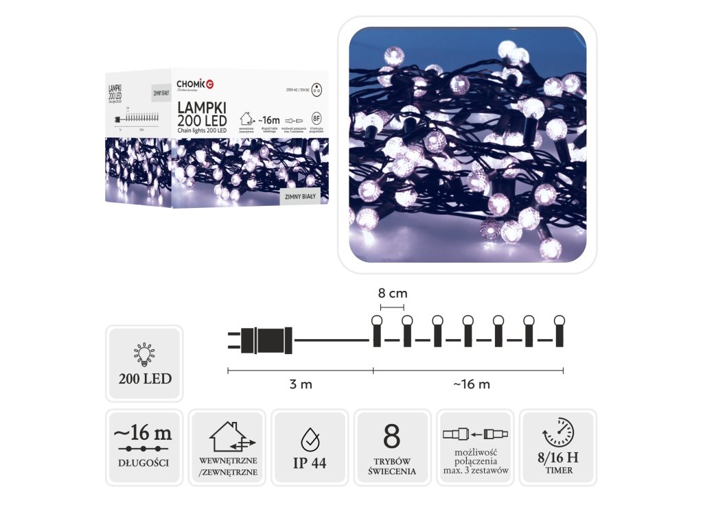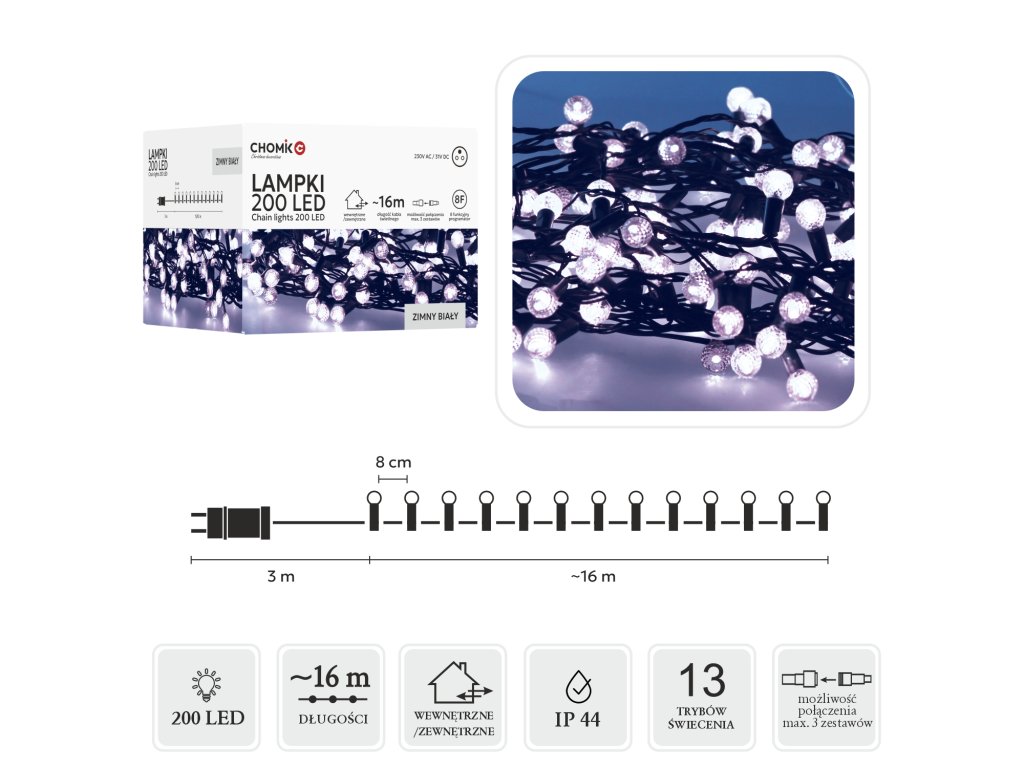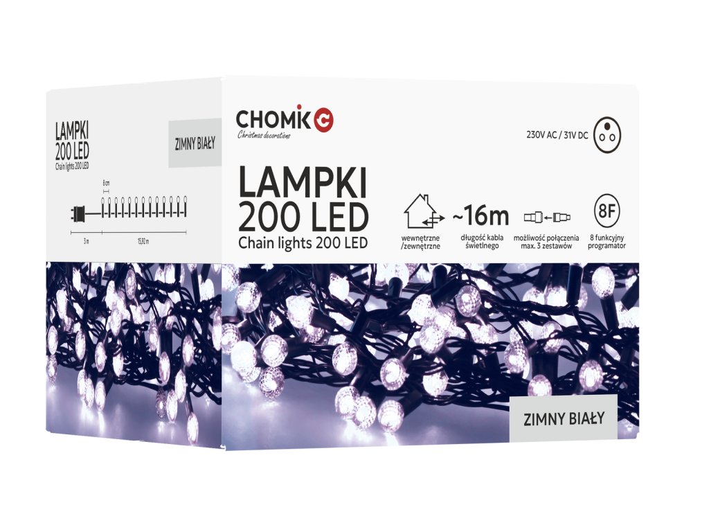 Zimné iluminácie ešte nikdy neboli také štýlové! Lampy LED Cherry Ball s 200 diódami v studenej bielej farbe rozžiaria každý kút vášho domu alebo záhrady ľadovým leskom ???16 metrov svetelnej dekorácie