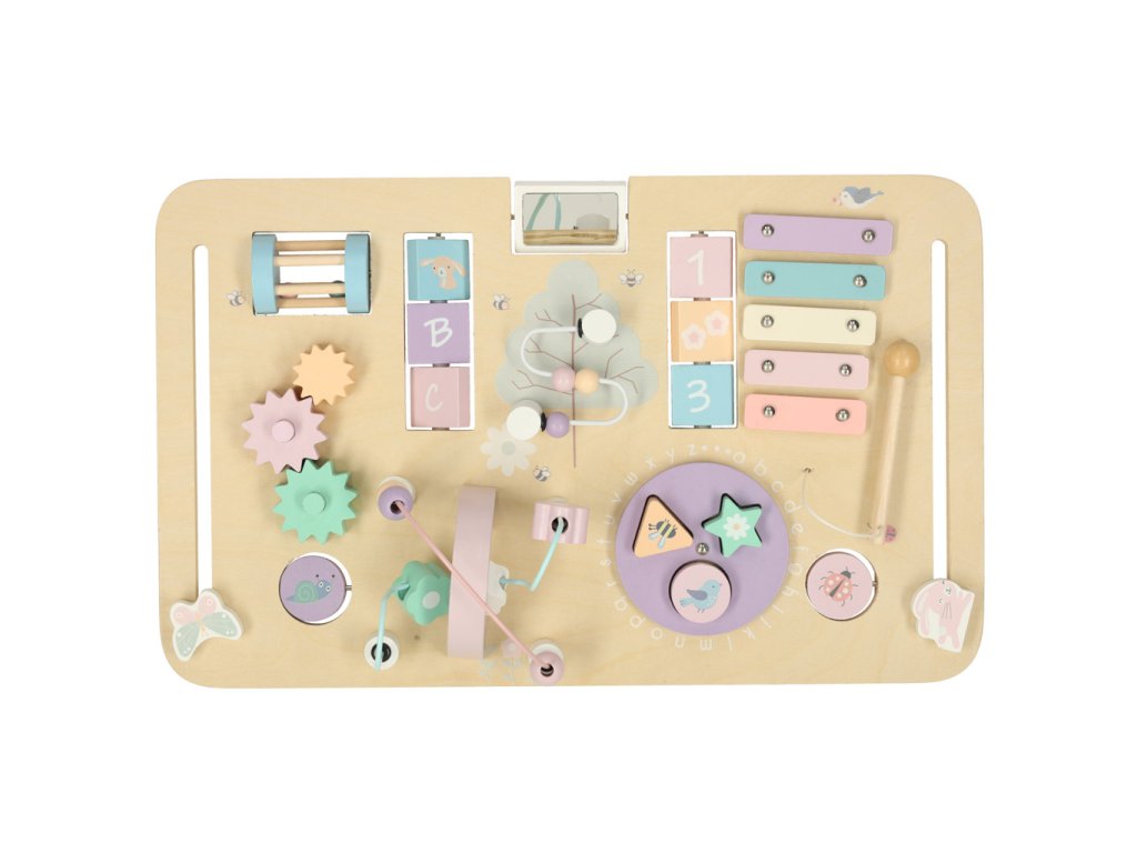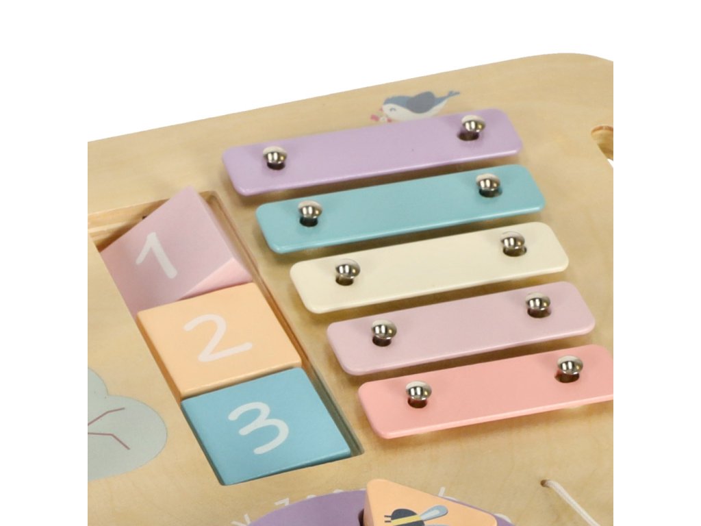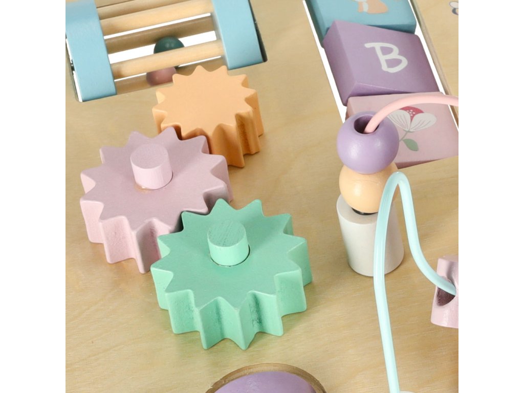 Je vyrobený z dreva so zaoblenými hranamiktoré zaručujú bezpečnosť počas hry. Všetky prvky sú natreté netoxickými farbami, takže sú bezpečné pre batoľatá. Pastelové farby priťahujú pozornosť a dokonale zapadajú do detskej izby. Výrobok spĺňa všetky európske bezpečnostné normy a má certifikát CE.