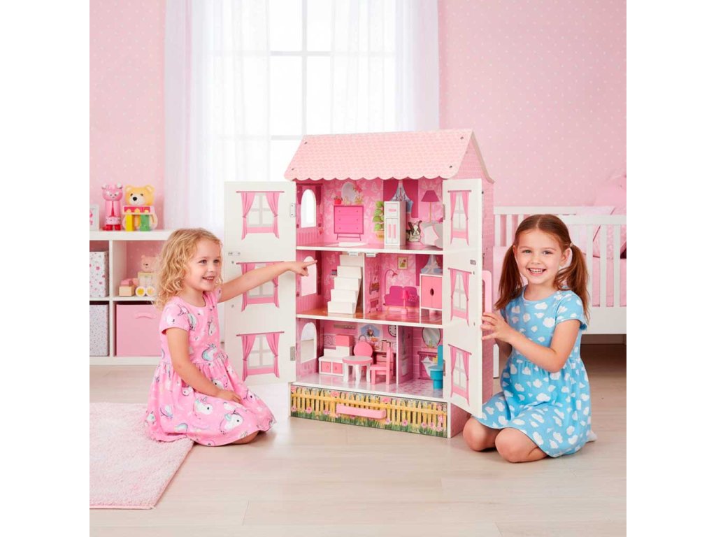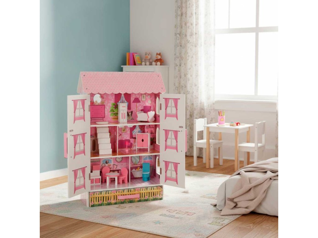 Otvárací domček pre bábiky v pôvabnom štýle bude nielen miestom na kreatívnu hru, ale aj ozdobou detskej izby. Domček má tri poschodia s kuchyňou, kúpeľňou, spálňou, obývačkou a schodiskom. Dvere a zásuvky uzamykateľné na magnet uľahčujú udržiavanie poriadku v izbe - hračky vo vnútri po hraní jednoducho upratajte.