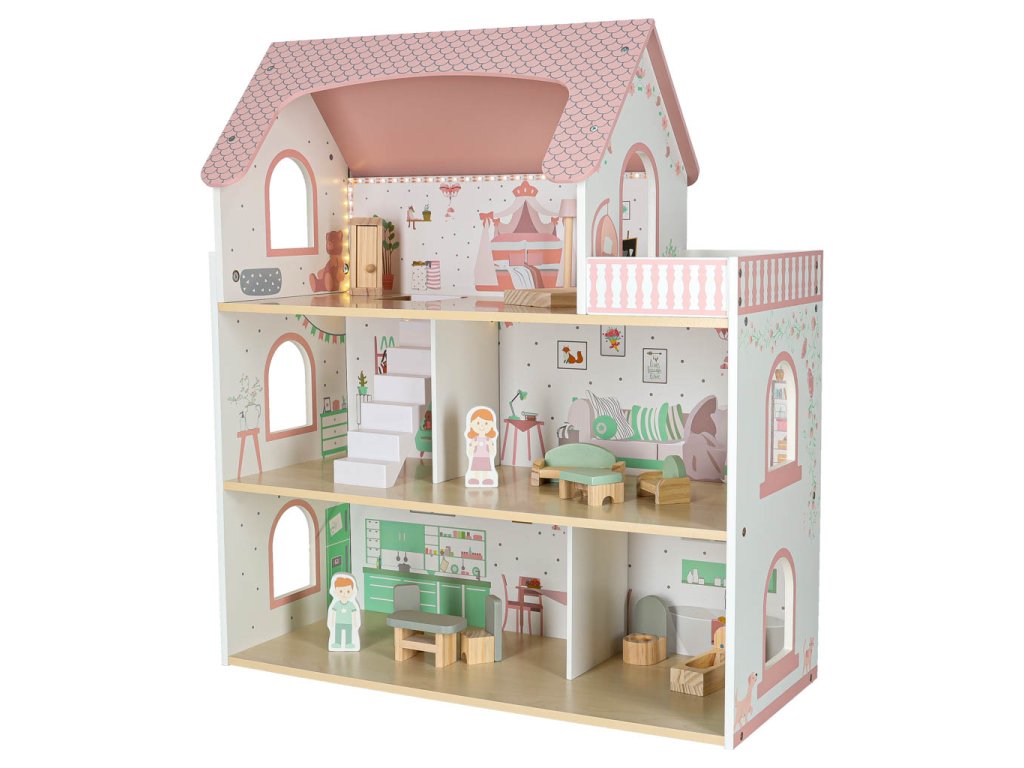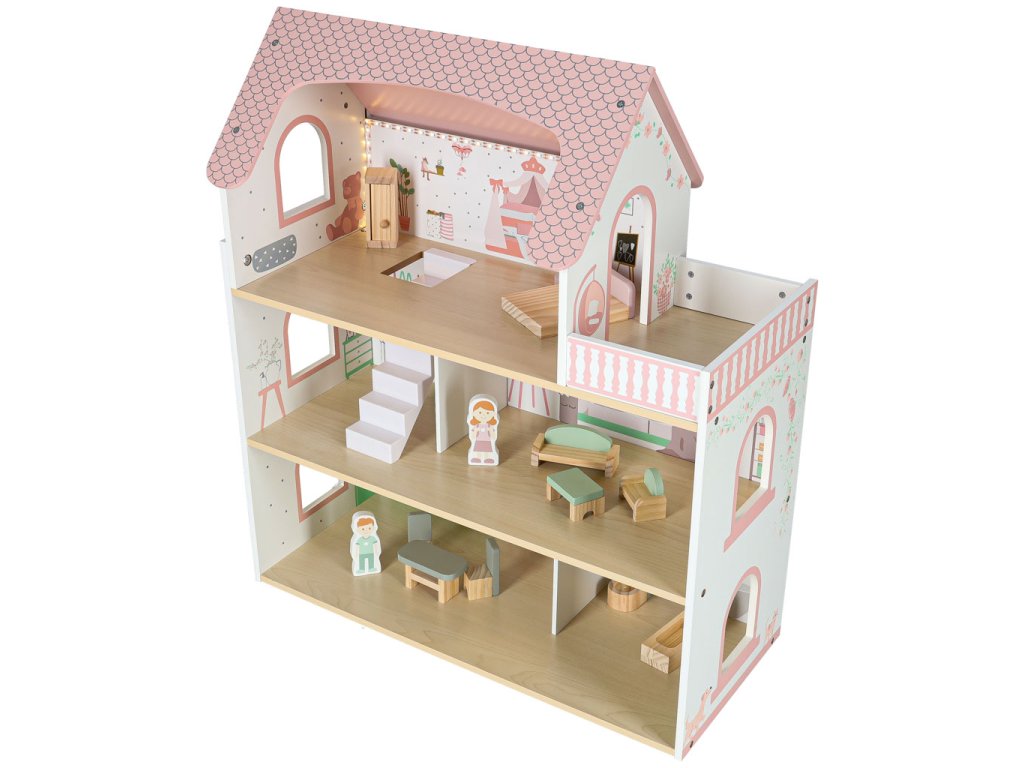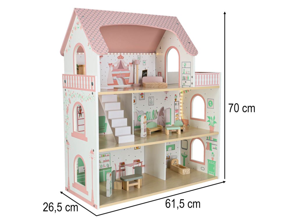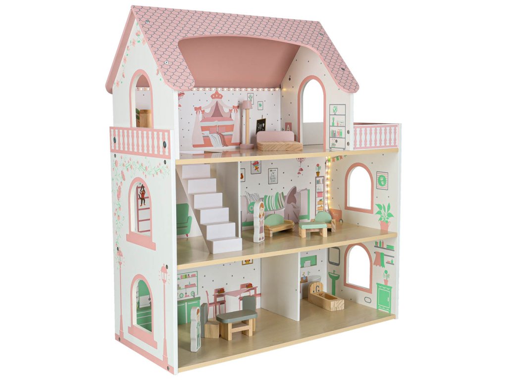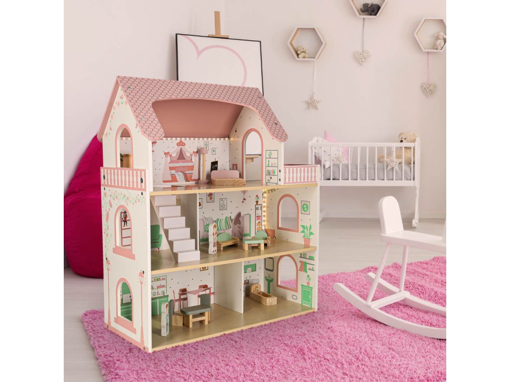 LULILO Peonio drevený domček pre bábiky 70cm LED ružový