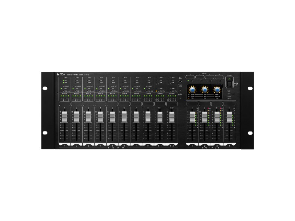 M-864D - Digitálny zvukový procesor s predným panelom vybaveným tlmičmi; 8 mik.-linových vstupov, 6 stereo linových vstupov, 4 zvukové zbernice, 6 zvukových výstupov - TOA