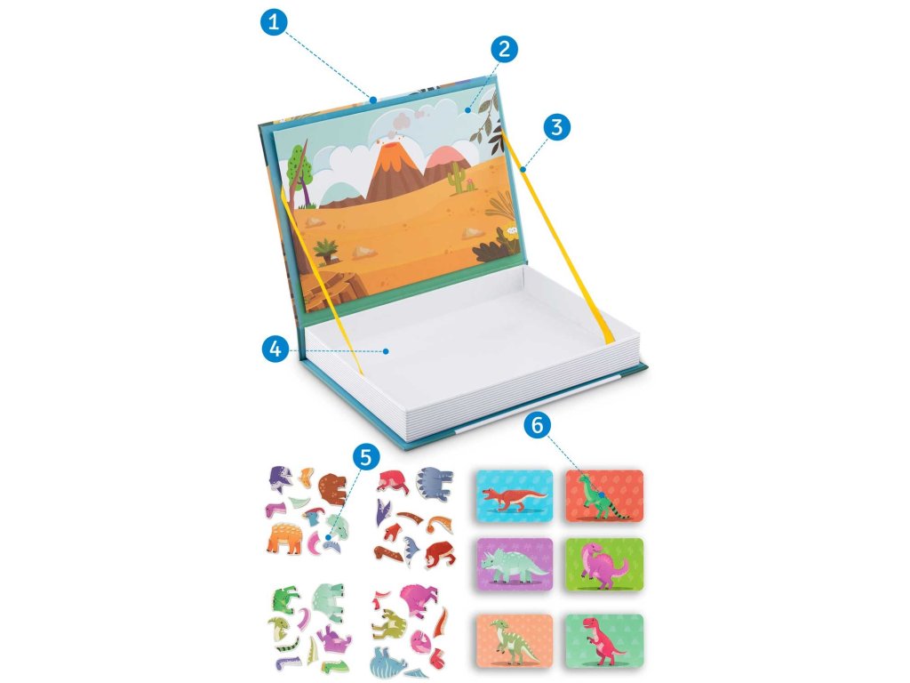 - balenie obsahuje magnetické pozadie na nalepenie dinosaurov, slúži aj ako odkladacia priehradka.