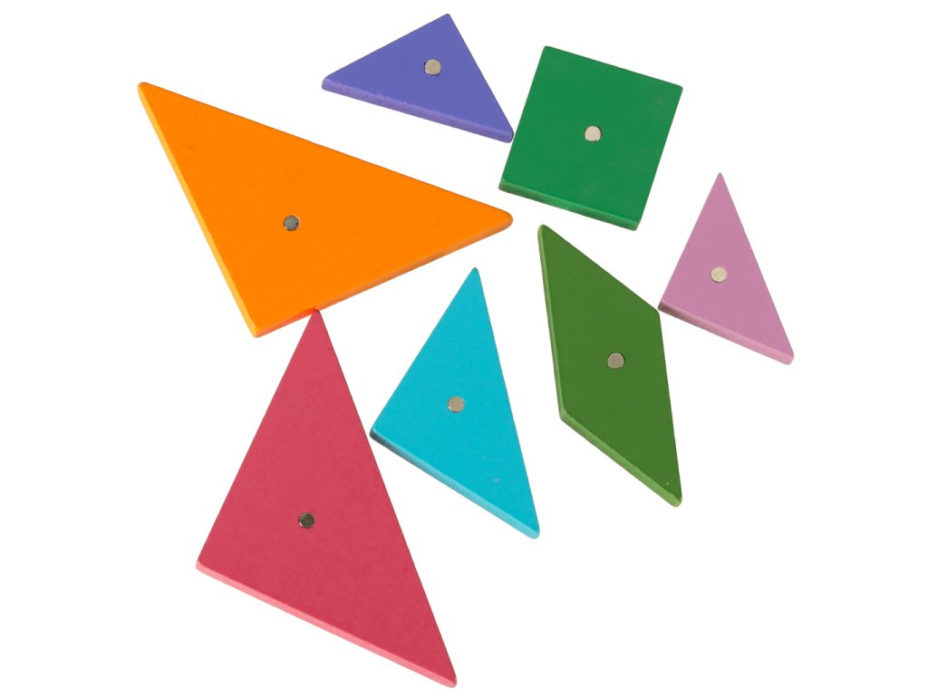sedem drevených farebných geometrických figúr s magnetmi