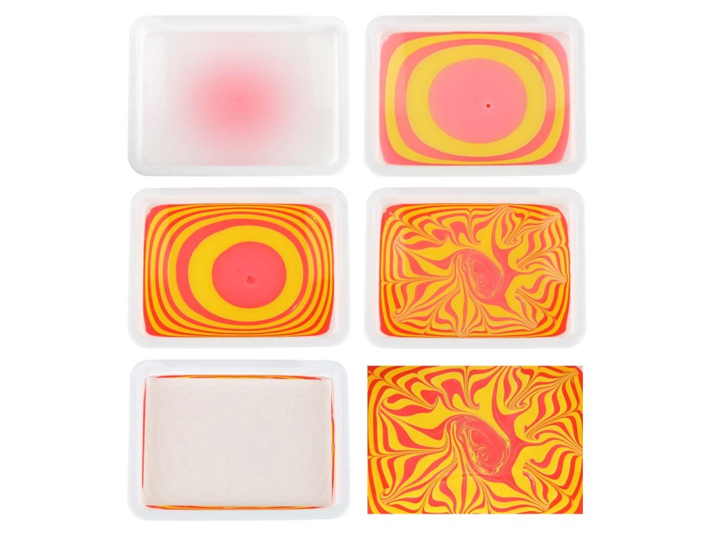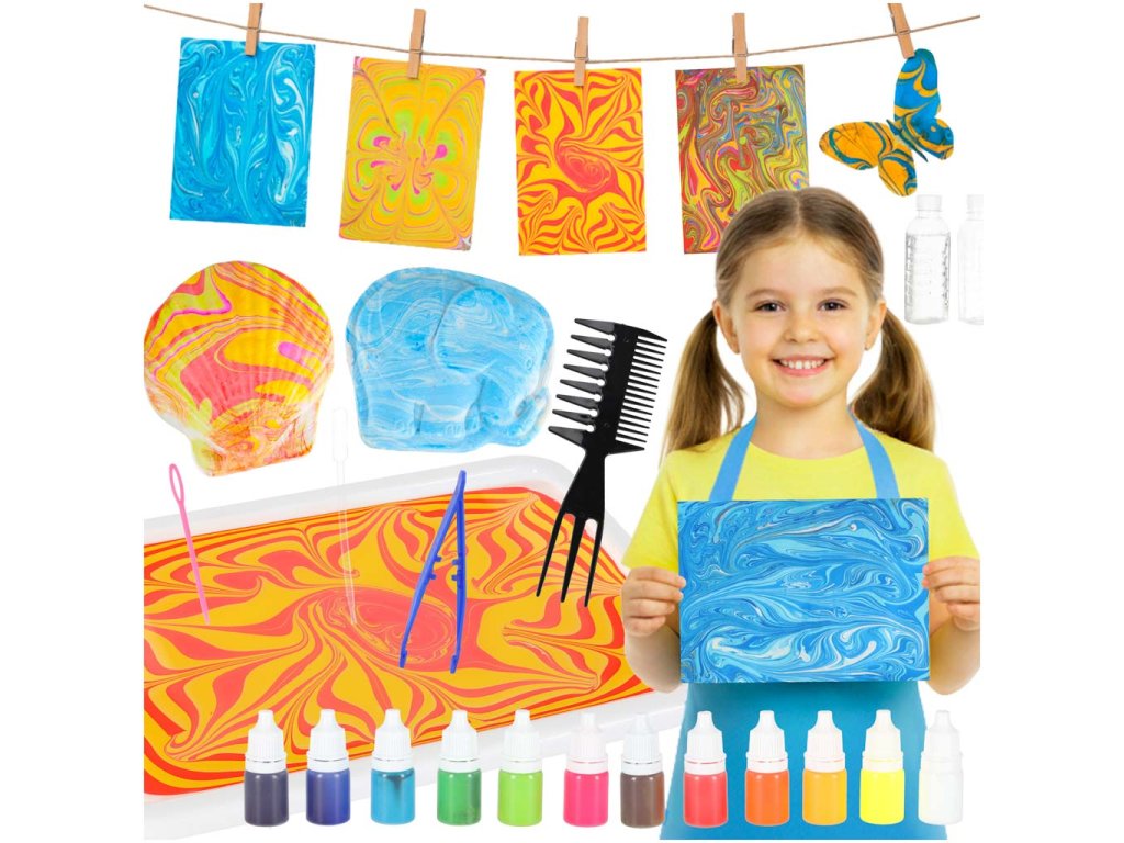 Každá kvapka farby sa premení najedinečný abstraktný vzor, ktorý sa po odraze na papieri stane malým umeleckým dielom. Umenie maľovania na vodu si nevyžaduje žiadny talent ani predchádzajúce skúsenosti - len zvedavosť a trochu predstavivosti. Sledovanie farieb, ktoré sa rozlievajú po hladine a vytvárajú veľkolepé formy, je čistá mágia, ktorá rozvíja a upokojuje. Súprava, ktorá používa farby ebru na vodnej báze abezpečné prísady, je vhodnápre deti od 6 rokov. Je to dokonalá STEM vzdelávaciahra, ktorá stimuluje logické myslenie, kreativitu amanuálne zručnosti - a zároveň spája generácie.