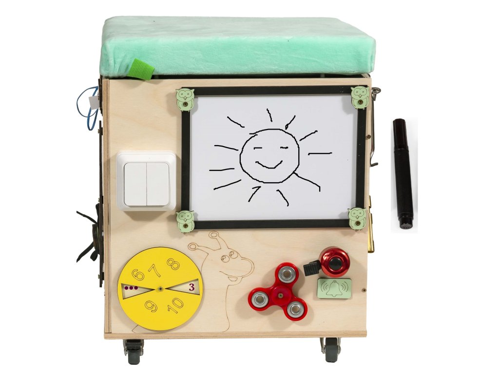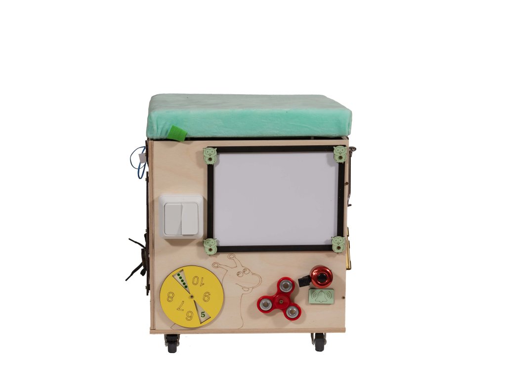 Puf je vybavený otočnými kolieskami. Zdvíhacie sedadlo s mäkkou hubou, čalúnené rúnom.