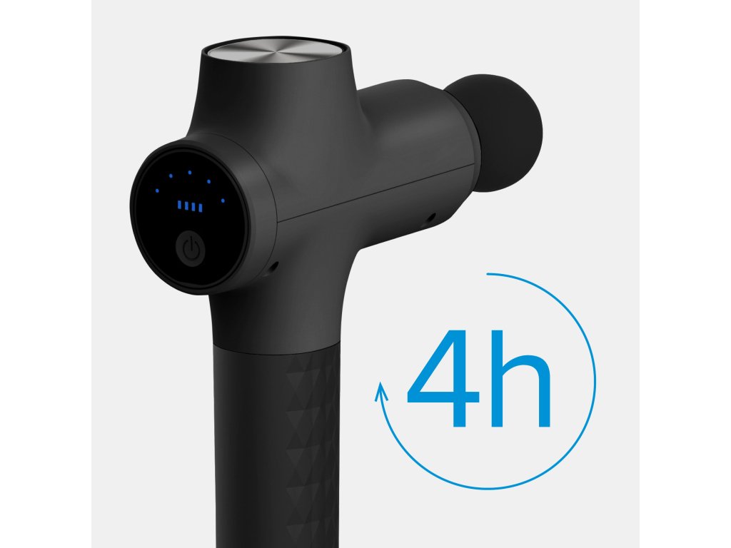 Masážna pištoľ Rebel je vybavená vstavanou 1800 mAh batériou. To znamená, že v závislosti od zvoleného nastavenia rýchlosti dokáže na jedno nabitie fungovať až 4 hodiny. Stav batérie môžete rýchlo skontrolovať pomocou LED indikátora na kryte.