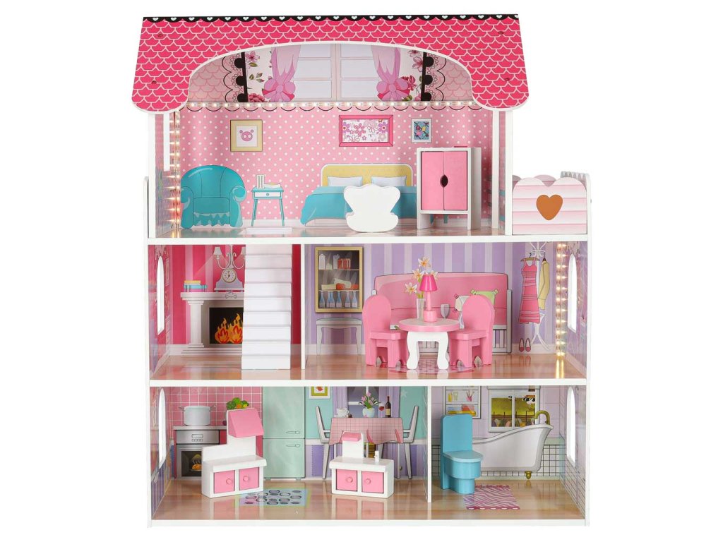 MDF drevený domček pre bábiky + nábytok 70cm ružový LED