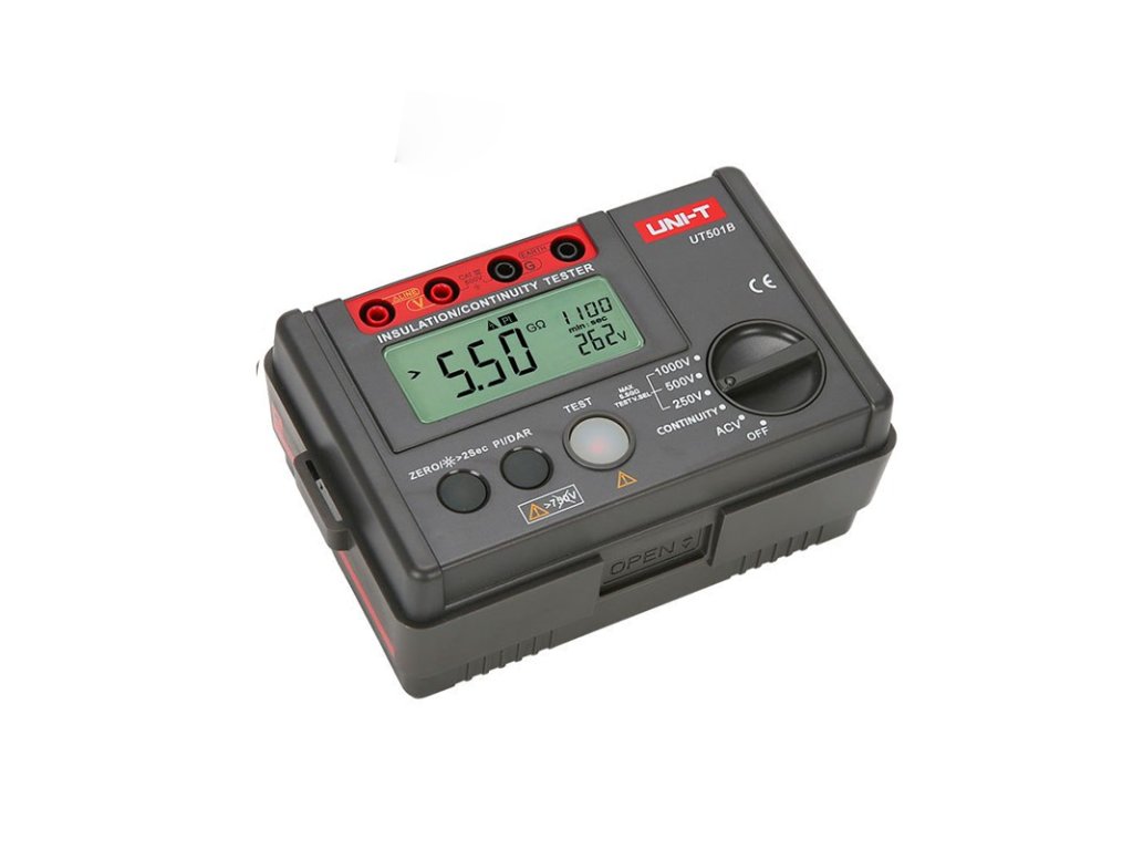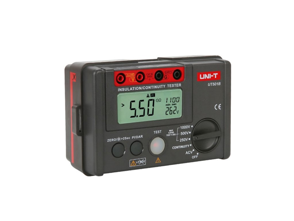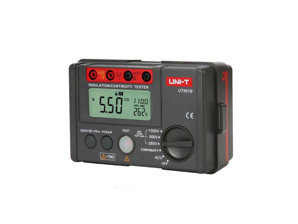 Merač izolačného odporu UNI-T UT501B je digitálny merací prístroj určený pre elektronikov a elektrikárov. Umožňuje meranie veľkých odporov až do 5 GOhm pri skúšobnom napätí 1000 V. Okrem toho merač umožňuje meranie striedavého napätia a meranie malých odporov. Z ďalších funkcií stojí za zmienku test dielektrickej absorpcie, indexovanie polarizácie alebo funkcia nulovania. Tento model spĺňa normu IECG1010.