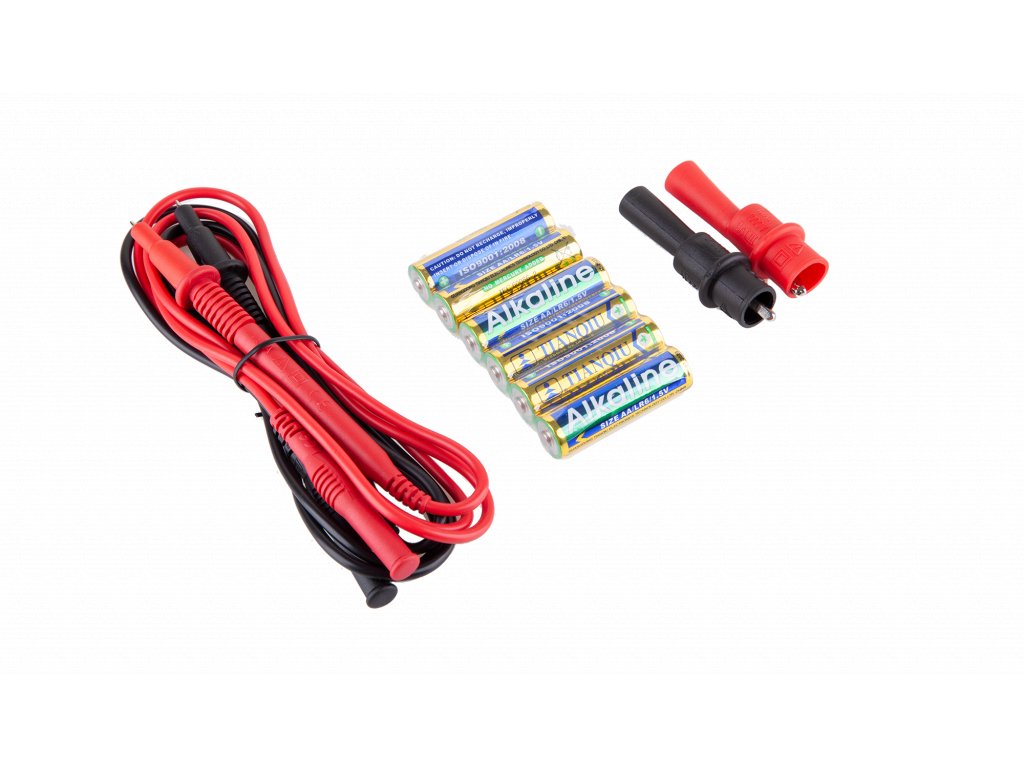 Súčasťou dodávky: Batérie, testovacie káble, krokosvorky, prepravný kufrík
