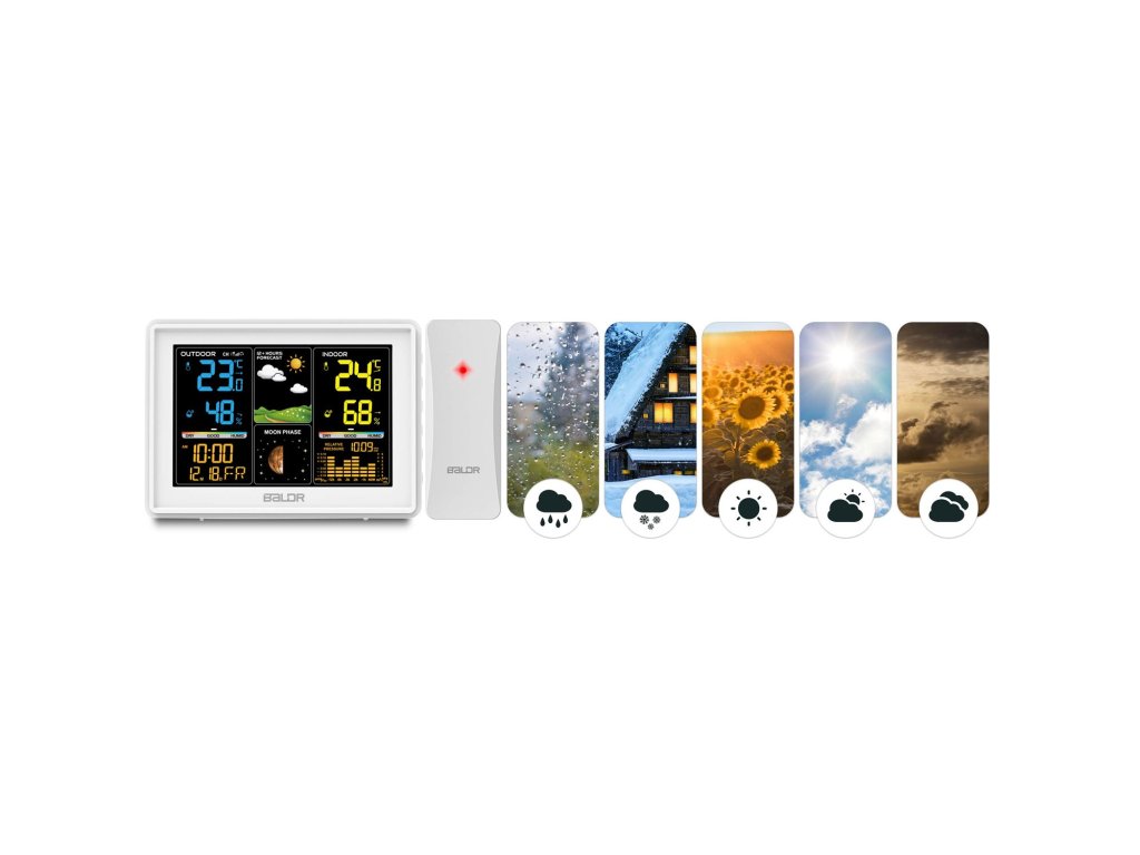 - Meteostanica nepretržite meria teplotu, tlak a vlhkosť, analyzuje a poskytuje predpovede počasia na nasledujúcich 12-24 hodín.
