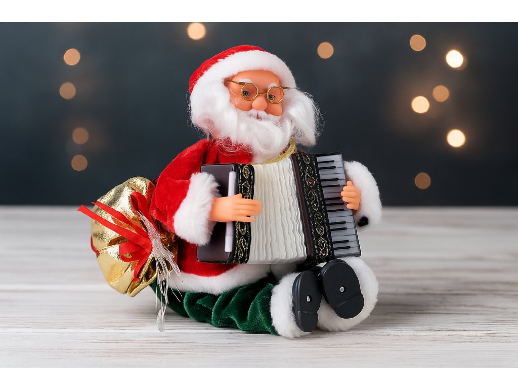 ?? MIKULÁŠ S AKORDEÓNOM 25,5 CM - HRAJÚCI A SVETELNÝ LED, OVÁDANÝ ZVUKOM ???