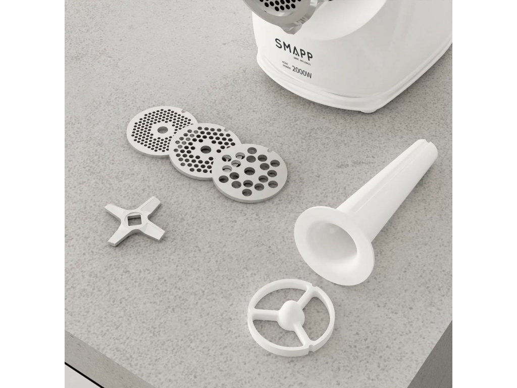 Základné vybavenie sitko z nehrdzavejúcej ocele s priemerom otvorov 2.7 mm, 4 mm, 8 mm, mäsová nadstavba, podávač, obojstranný nôž, distančná vložka, zásobná misa