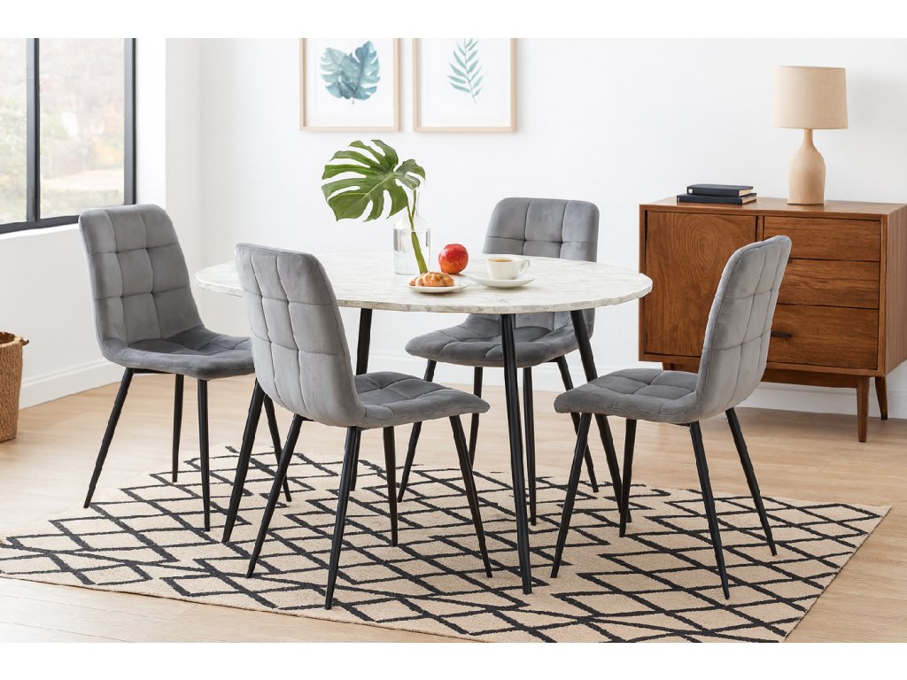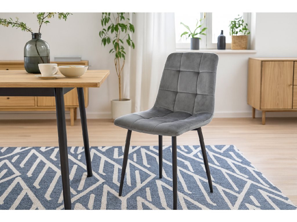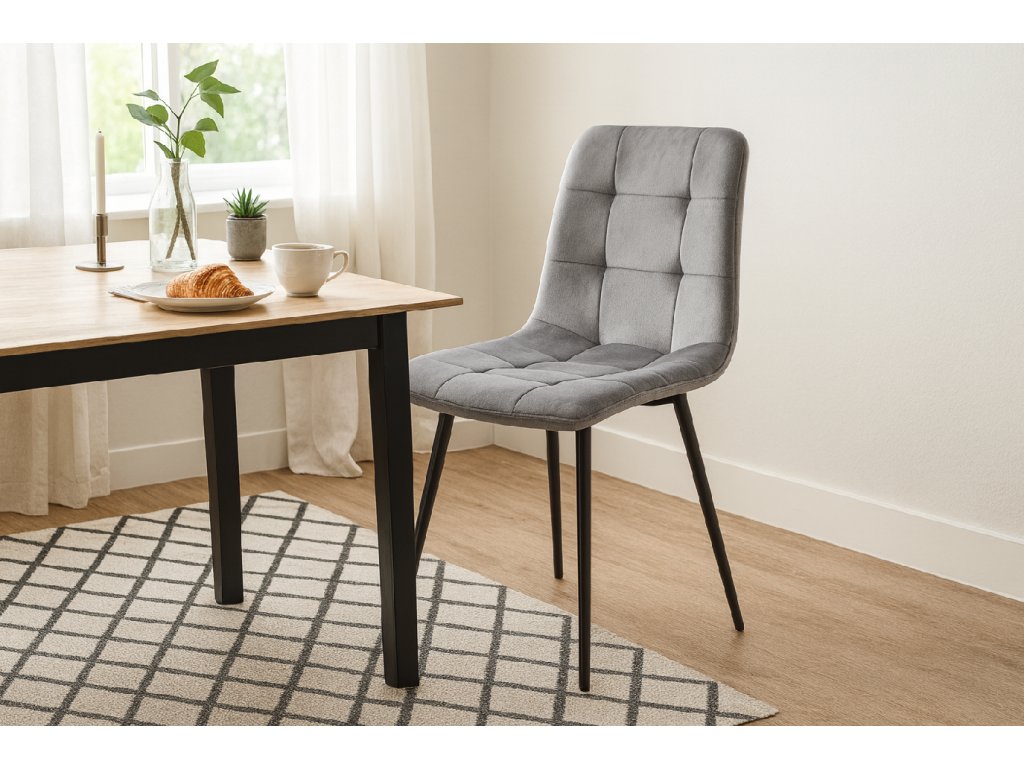 Moderná zamatová stolička v sivej farbe je spojením elegancie a pohodlia. Prešívané operadlo, mäkké čalúnenie a pevná konštrukcia robia z nej ideálny doplnok do obývačky, jedálne alebo kancelárie, dodávajúc interiéru štýl a útulnosť.