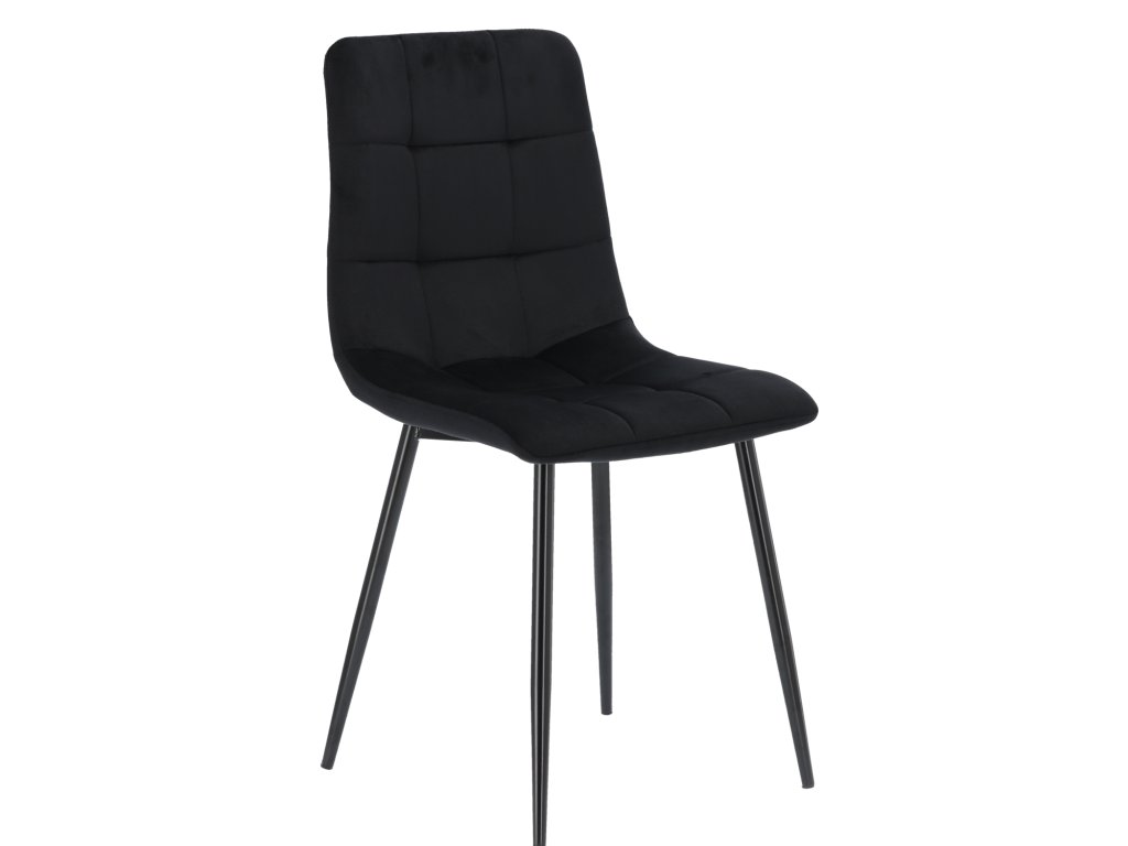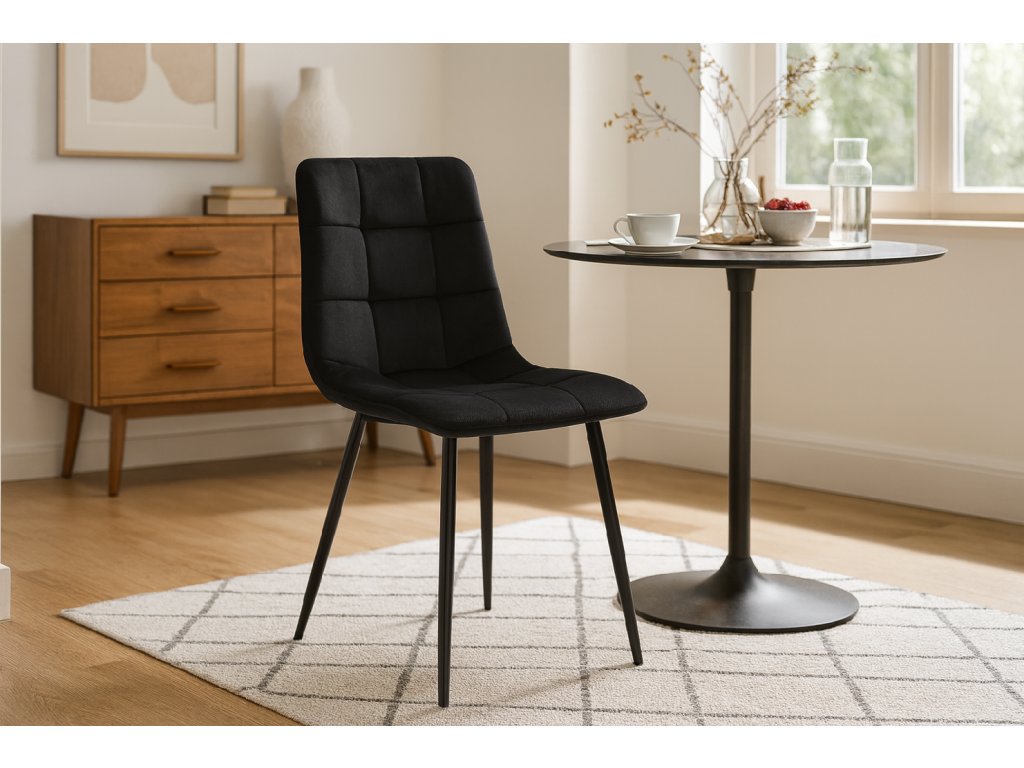 Moderná čierna zamatová stolička je elegancia a pohodlie v jednom. Prešívaná opierka, mäkké čalúnenie a pevná konštrukcia z nej robia ideálny doplnok do jedálne, obývačky alebo kancelárie, pričom interiéru dodáva šmrnc a štýl.
