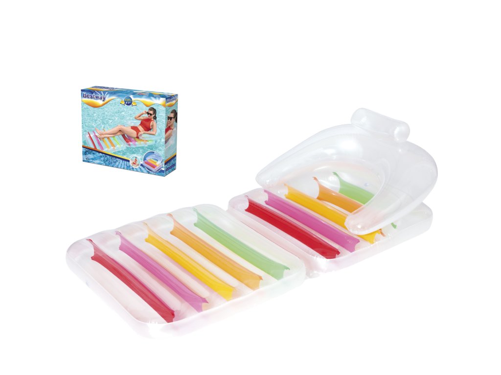 Nafukovací matrac Bestway v striebornej farbe s farebnými pruhmi, je nevyhnutným doplnkom výbavy počas dovolenky pri vode a nielen tam! Pohodlný, praktický, dokonale sa osvedčí počas zábavy aj odpočinku. Matrac, ktorý sa v okamihu môže zmeniť na pohodlné kreslo, je ideálny na bazén, pobyt pri jazere, na pláži pri mori, a neskôr na grilový večer. Rozmery hračky ako matraca sú 201 cm na 89 cm, pričom maximálne zaťaženie je 90 kg! Dodatočnou výhodou matraca je mäkká opierka počas odpočinku poležiačky aj posediačky vo funkcii kresla. Matrac je vyrobený z odolného vinylového materiálu s namontovaným bezpečnostným ventilom. Opierka je priehľadná, s nádychom do modro-striebornej farby, pričom sedadlo má žlté, ružové, červené, zelené a oranžové pruhy, čo robí, že vyzerá veľmi pekne a vkusne.V prípade poškodenia nafukovacieho povrchu môžeme matrac jednoducho opraviť vďaka priloženej opravnej záplate.