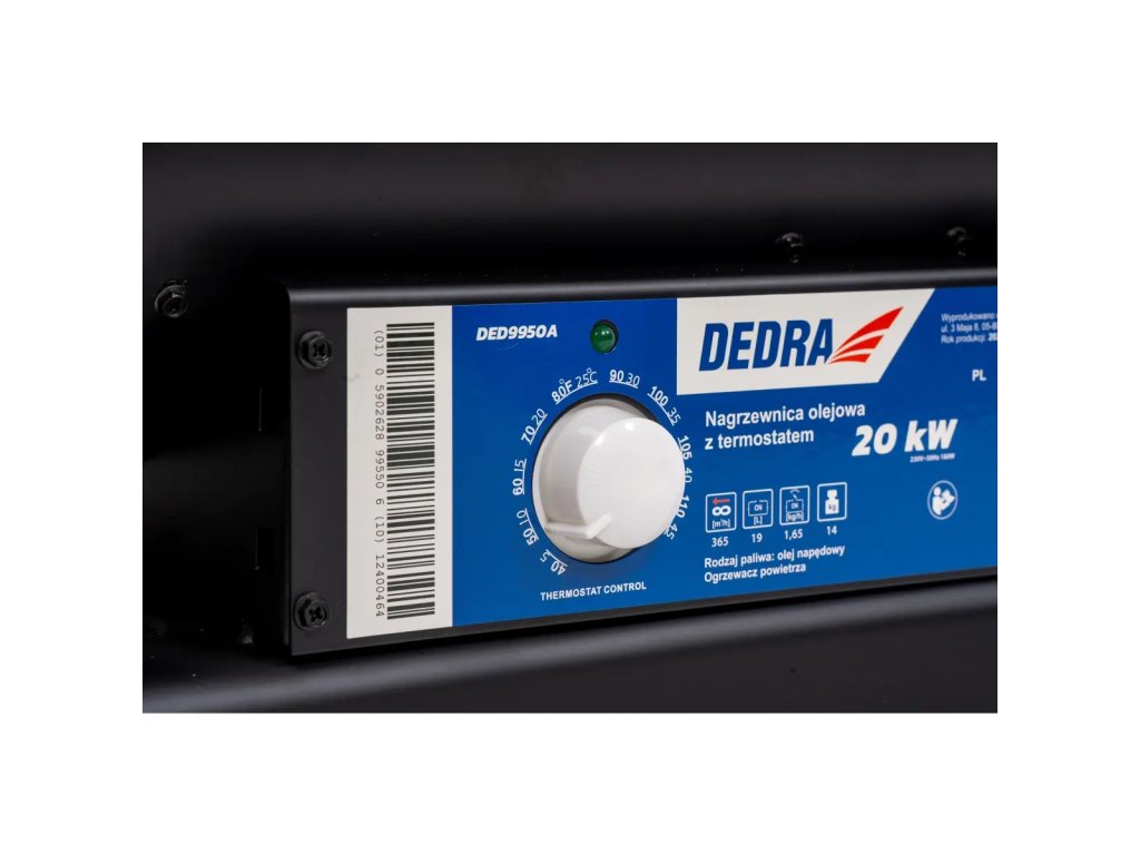 Protiprúdový ohrievač DED9950A je určený na použitie v uzavretých miestnostiach. Používa sa na vykurovanie ne bytových priestorov, ako sú dielne, sklady, výrobné haly, skleníky alebo pri opravách astavebných prácach. Ohrievač sa prevádzkuje na naftu alebo ľahký vykurovací olej. Spotrebič sa smie používať len v miestnostiach s účinným vetraním. Kovový plášť sa nezahrieva ani počas dlhodobej prevádzky. Bezpečnú prevádzku zabezpečuje tepelná ochrana. Ohrievač má ovládací gombík na nastavenie a úpravu teploty. Rukoväť na jednoduchú prepravu a skladovanie.Tento výrobok sa nemôže používať ako primárny zdroj vykurovania.