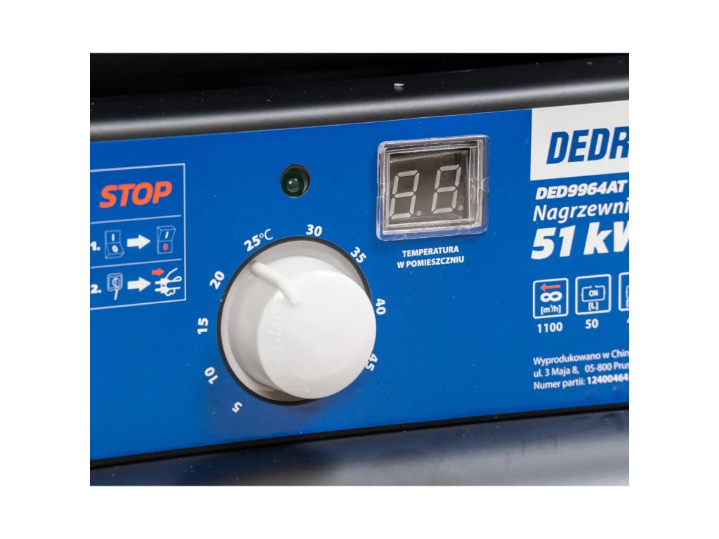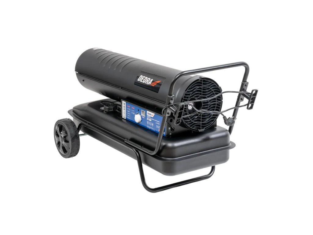Protiprúdový ohrievač DED9951A je určený na použitie v uzavretých miestnostiach. Používa sa na vykurovanie ne bytových priestorov, ako sú dielne, sklady, výrobné haly, skleníky alebo pri opravách astavebných prácach. Ohrievač je možné prevádzkovať s naftou alebo ľahkým vykurovacím olejom. Zariadenie sa môže používať len v dobre vetraných miestnostiach. Kovový plášť sa nezahrieva ani počas dlhšej prevádzky. Kovový kryt sa nezahrieva ani počas dlhej prevádzky. Ohrievač má ľahk o čitateľný displej, ktorý zobrazuje teplotu okolia, a gombík na reguláciu teploty. Kolieska a rukoväť uľahčujú prepravu a skladovanie.Ohrievač má ľahko čitateľný displej, ktorý zobrazuje okolitú teplotu, aovládač teploty.Tento výrobok sa nemôže používať ako primárny zdroj vykurovania.