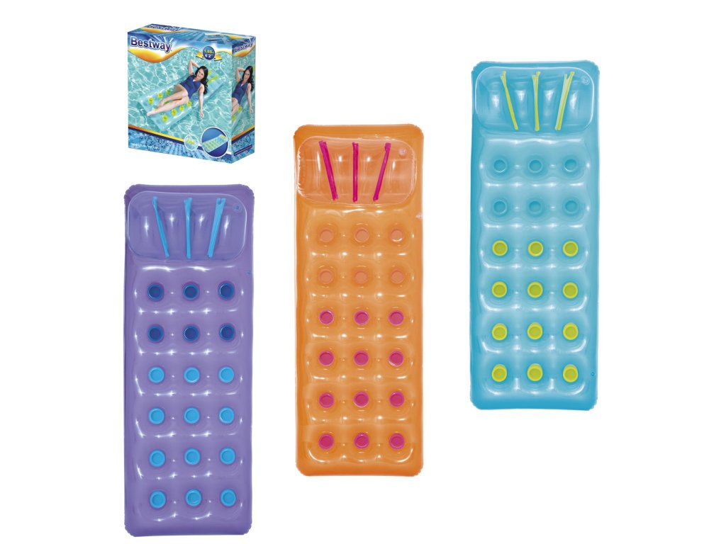 Hrubý nafukovací matrac na plávanie 188 x 71 cm Bestway 43015. Jednomiestny, nafukovací plážový matrac je ideálnou voľbou na pláž alebo do záhradného bazéna! Jeho rozmery 183 x 71 cm umožnia každému jednoduché a príjemné používanie. Môžeme sa pohodlne položiť a opaľovať sa. Plávať po celom jazere. Produkt je dostupný v troch módnych farbách. Použitá konštrukcia Coil-beam je množstvo trubíc spájajúcich hornú časť matraca so spodnou. Vďaka tomu matrac "pruží" a prispôsobuje sa postave používateľa. Navyše každá trubica môže slúžiť ako miesto na plechovku studeného nápoja. Zabudovaný nafukovací vankúš ti poskytne ešte väčší komfort a umožní pohodlne sa uložiť počas odpočinku.