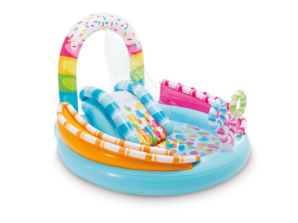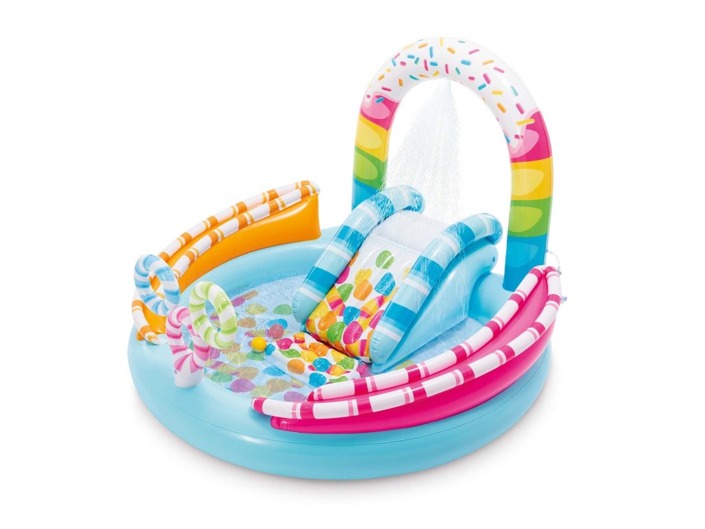 Nafukovacia Krajina Cukríkov je vhodná pre batoľatá už nad 2 roky, ale očarí aj staršie deti. Intex sa postaral o to, aby všetky deti mohli bezpečne využiť energiu a tešiť sa z vodnej zábavy.
