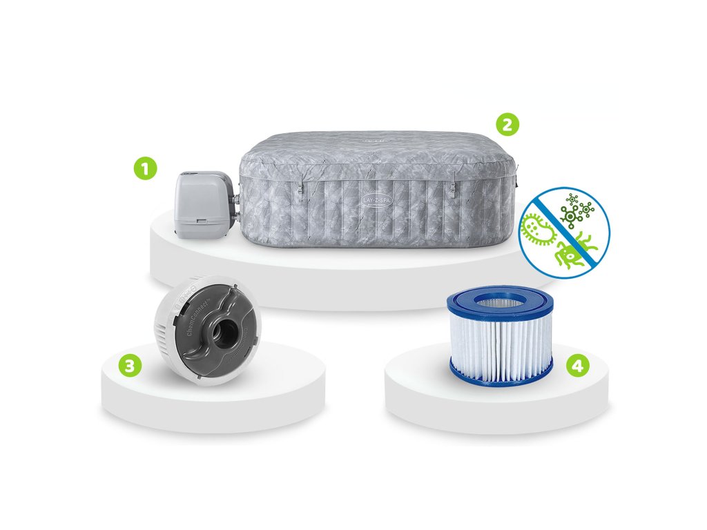 Voda v spa bude vždy čistá - všetko, čo potrebujete, pribaľujeme v súprave:- Vstavaná filtračná pumpa Pružný kryt -