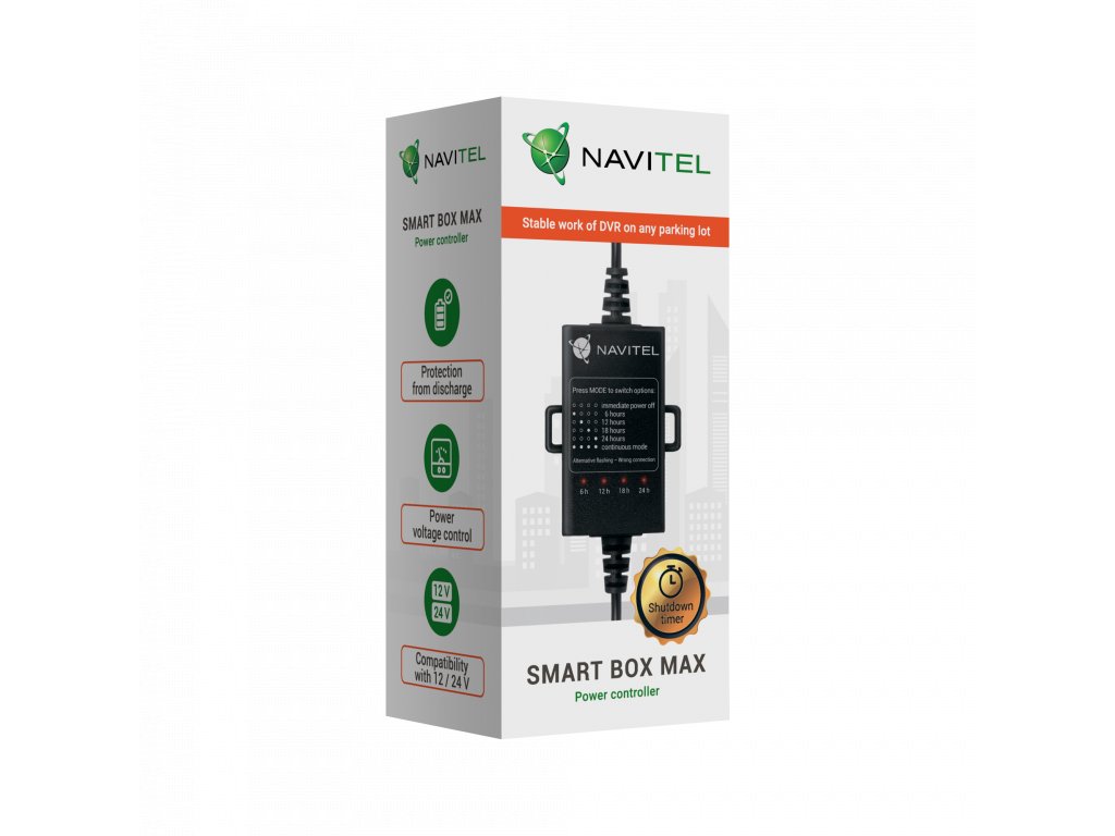 NAVITEL SMART BOX MAX chráni akumulátor vozidla pred úplným vybitím riadením jeho zostávajúceho prevádzkového času a napätia. Adaptér automaticky vypne napájanie rekordéra, keď napätie batérie klesne na určenú hodnotu alebo uplynie užívateľom nastavený čas (podľa toho, čo nastane skôr). NAVITEL SMART BOX MAX navyše chráni váš DVR pred prepätím.