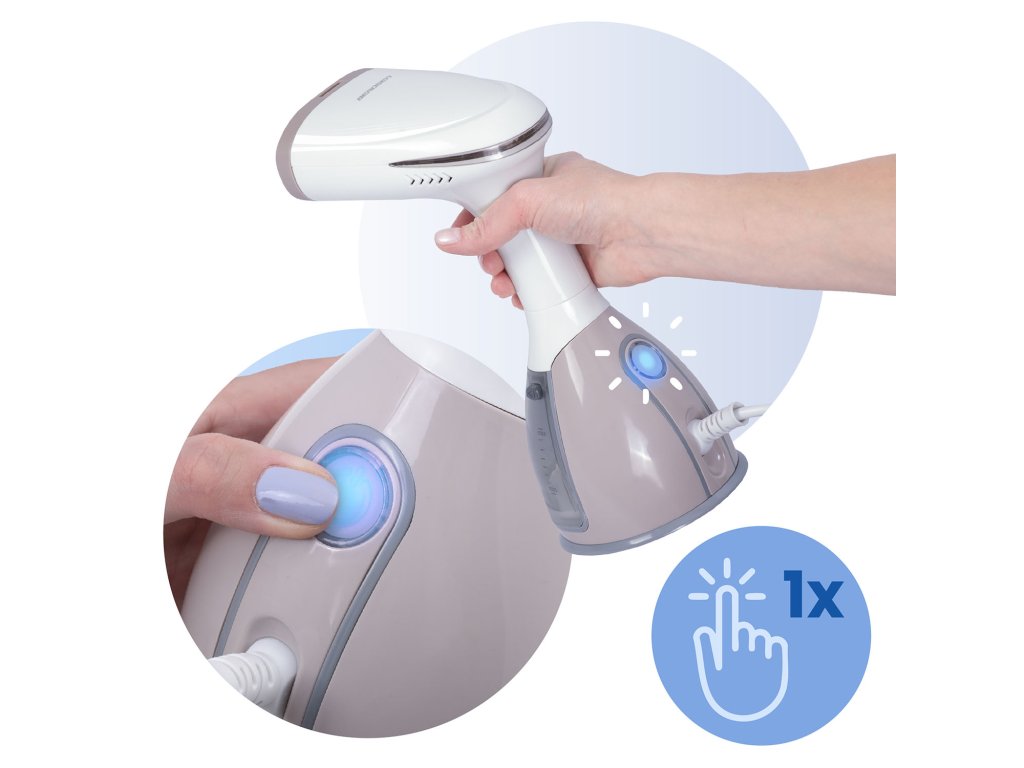 - Jediné tlačidlo — stačí jedno podsvietené tlačidlo na spustenie zariadenia a začatie výstreku pary.