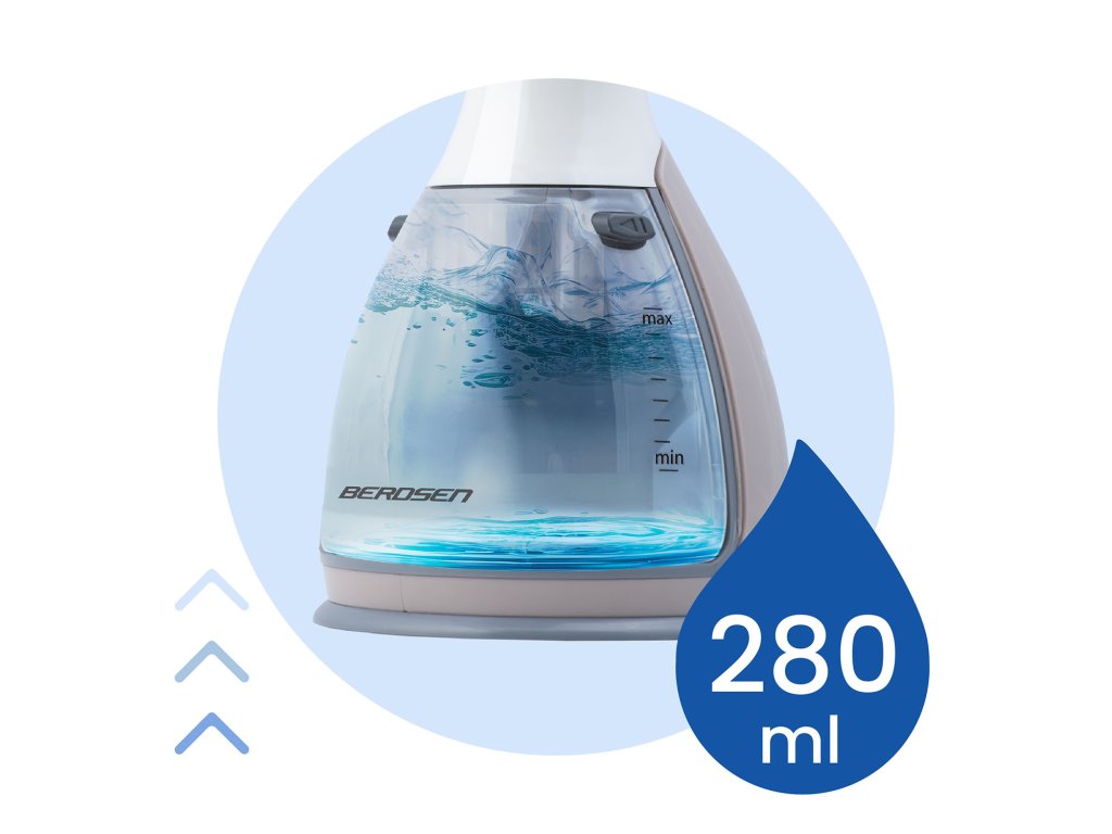 - Nádoba 280 ml — veľká a výkonná, vybavená plavákom — umožňuje žehlenie vodorovne.