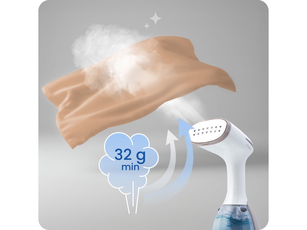 - Výstrek 32g/min zabezpečí silu pary vhodnú na zvládnutie aj odolných pokrčenín.