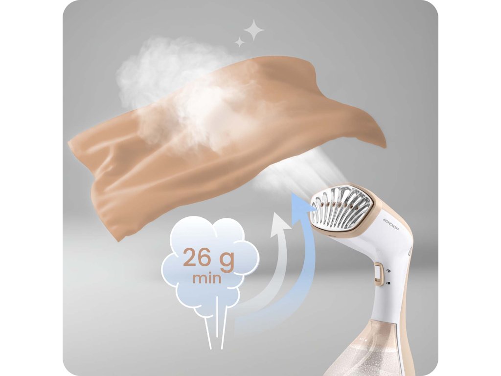 - Výstup 26 g/min zabezpečí paru dostatočne silnú, aby sa vyrovnala aj s trvdohlavými záhybmi.