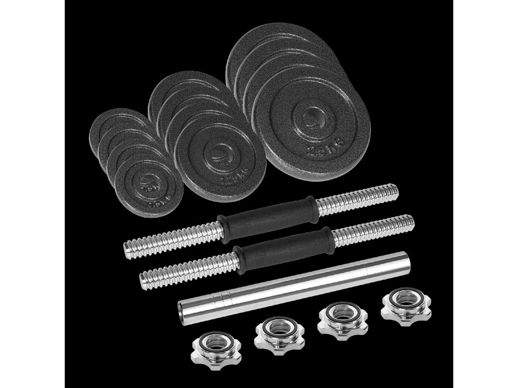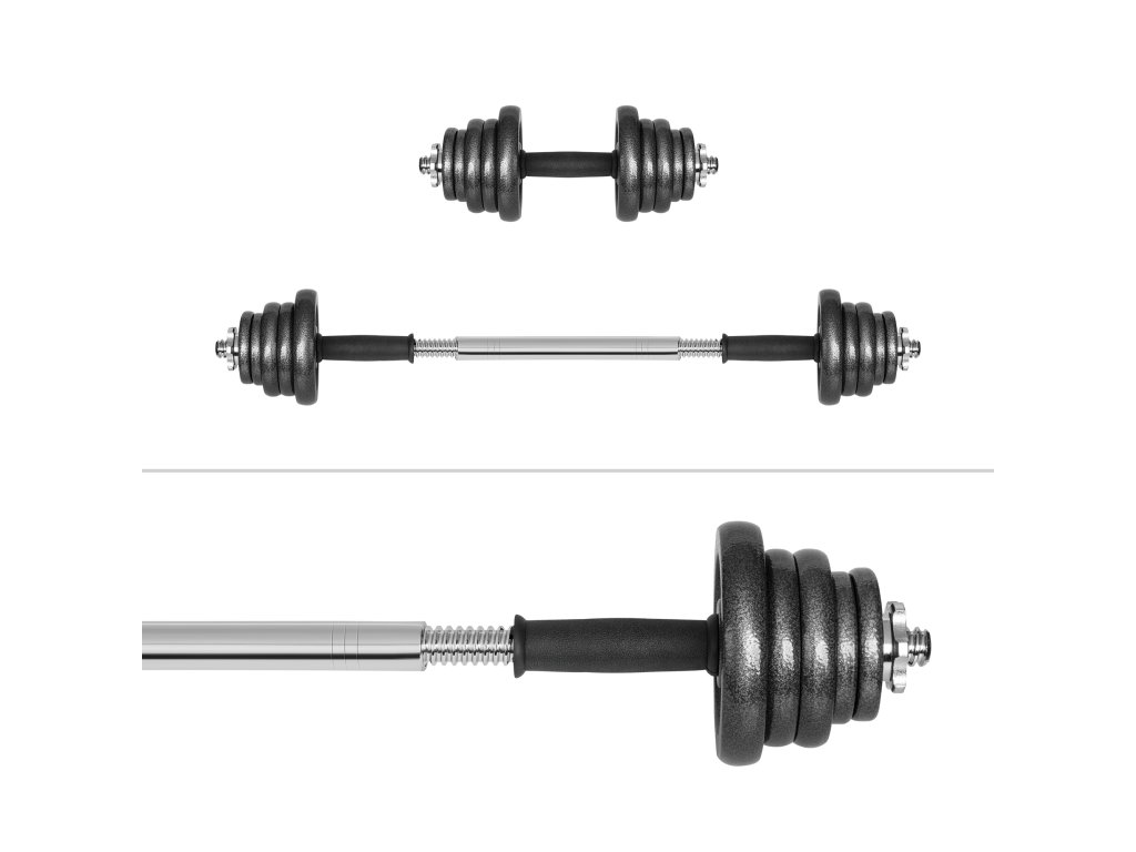 Priložený spojovací diel umožňuje spojiť dve tyče do jednej činky, čo významne rozširuje rozsah cvičení. Vďaka tomu v jednej súprave získate činky aj činku – ideálne riešenie na tréning celého tela bez potreby investovať do ďalšieho vybavenia.