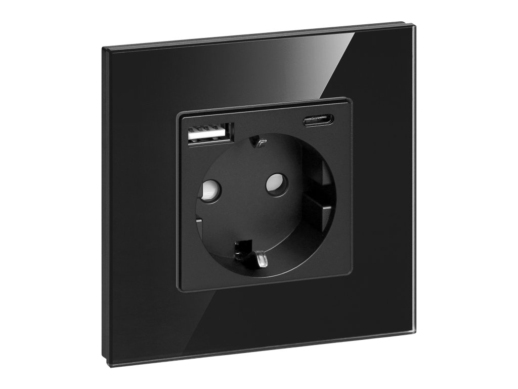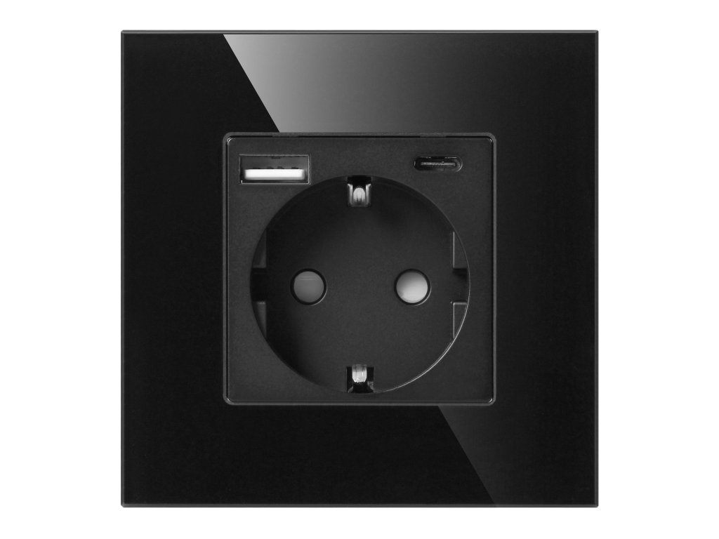 Nástenná zásuvka 2P+Z s nabíjačkou USB-A + USB-C, Schuko, 5VDC, 3A, čierna