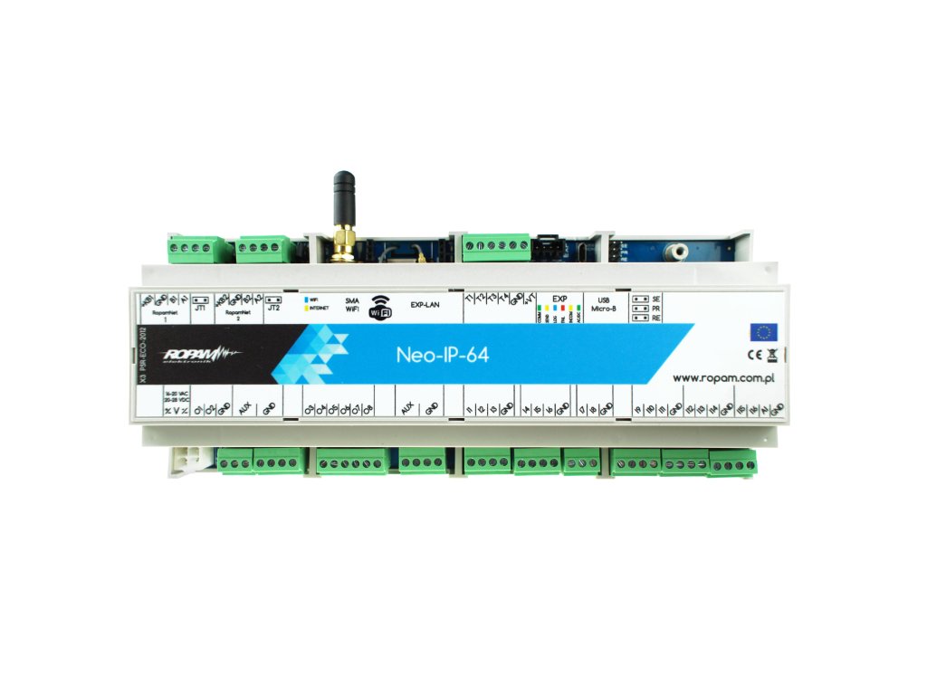 Veľkou výhodou ústredne Neo-IP-64-D12M je vstavaný modul Wi-Fi a komunikátor GSM. Výrazne uľahčujú realizáciu upozornení na udalosti a umožňujú vzdialené ovládanie alarmového systému a zariadení automatizácie. Kanál Wi-Fi je základným kanálom komunikácie. Ďalším prínosom je automatické prepnutie na modul GSM, v prípade nesprávnej funkcie Wi-Fi kanálu. Existuje možnosť pripojenia ústredne do káblovej ethernetovej siete po použití expandéru EXP-LAN.