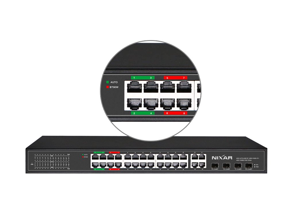 Neriadený sieťový prepínač NX-S5800P-24G4TC-S je pokročilý gigabitový model, triedy Enterprise, určený pre najnáročnejšie inštalácie systémov CCTV, VoIP a štruktúrované siete. Okrem štandardných portov PoE v štandarde 802.3af/at prepínač disponuje 4 dedikovanými portami AUTO s autoregulačným napätím 24V / 48V a 4 portmi v štandarde 802.3at+/bt, umožňujúci pripojiť až 90W napájania na 1 porte.